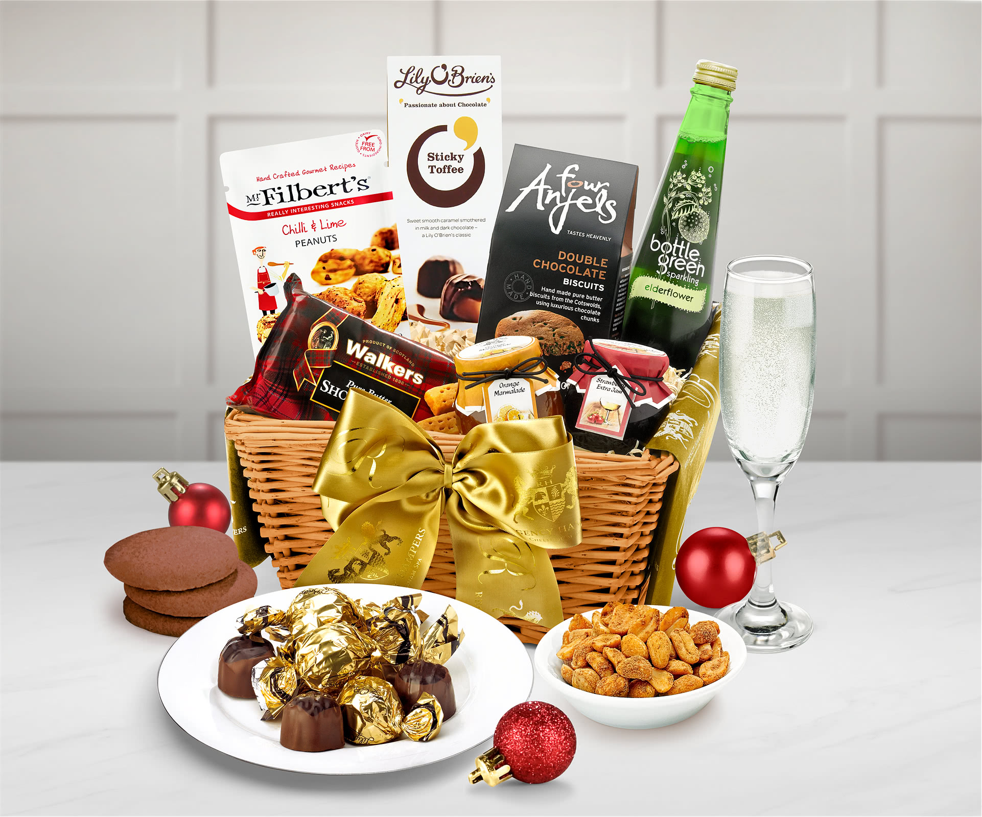 Alcohol-Free Celebration Essential: The hamper has Bottlegreen's elderflower sparkling pressé, a non-alcoholic fizz. It offers a fresh, floral drink for those who skip spirits. The taste is crisp, and its appearance makes it perfect for a toast, regardless of the celebration.