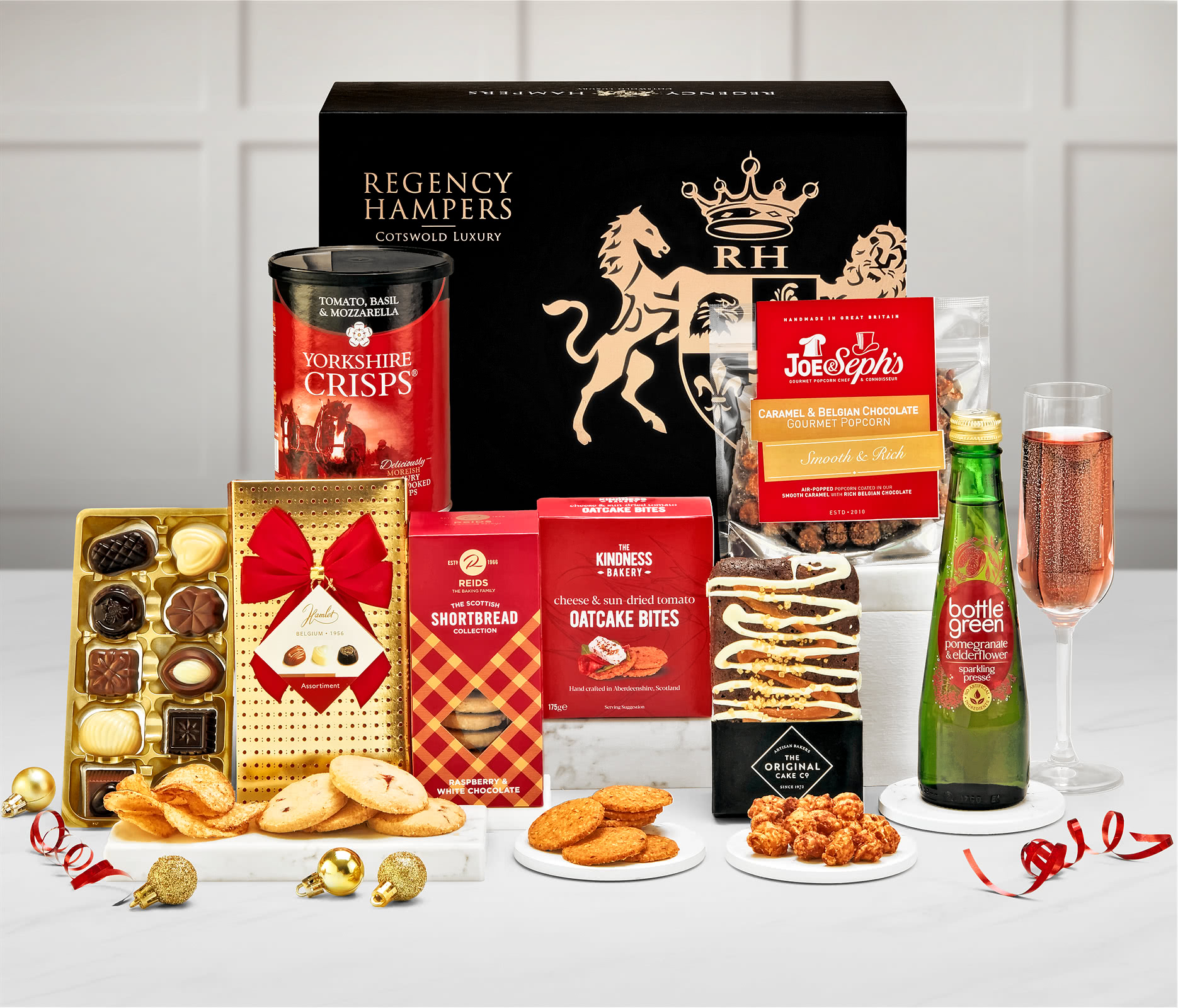 Spirited Celebrations Without the Spirits: This deluxe hamper features a refreshing Bottlegreen Pomegranate & Elderflower Sparkling Pressé, offering a sophisticated non-alcoholic alternative perfect for those who prefer to celebrate without spirits. The crisp, fruity sparkle pairs beautifully with the selection of gourmet treats.
