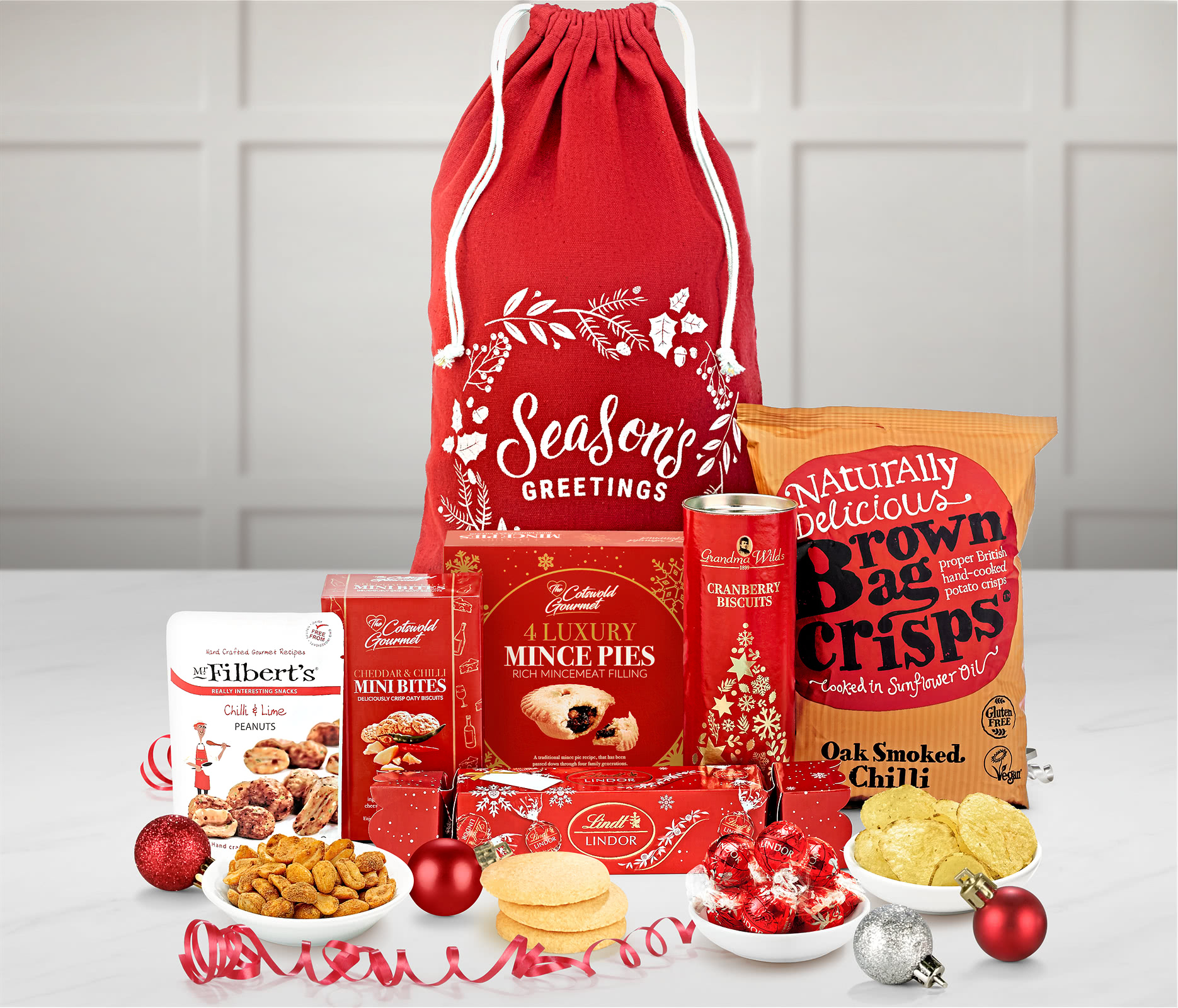 Artisanal Festive Treats: A Christmas gift sack with an array of treats. The Cotswold Gourmet's mince pies, a bit sweet and crumbly, ooze holiday comfort, while cheddar cheese bites and brown bag crisps balance the sweeter flavours.