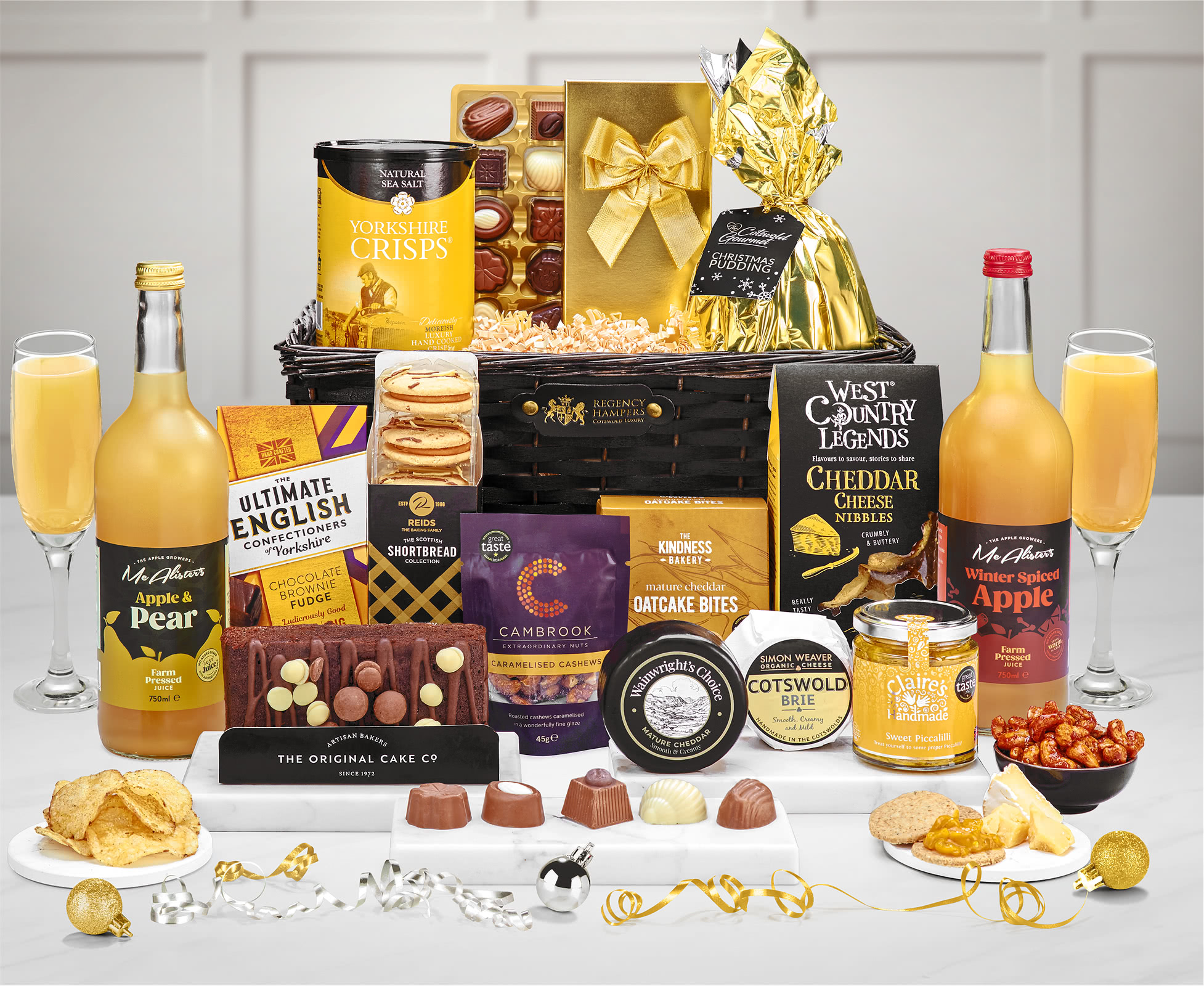 Artisan Cheese & Accompaniments: Savour a specialist selection of British cheeses, including Vintage Mature Cheddar Truckle, Organic Cotswold Brie, and complementary nibbles. Paired with sweet piccalilli and artisan oatcake bites, this curated collection offers the perfect festive cheese board experience.