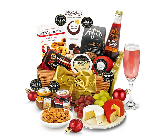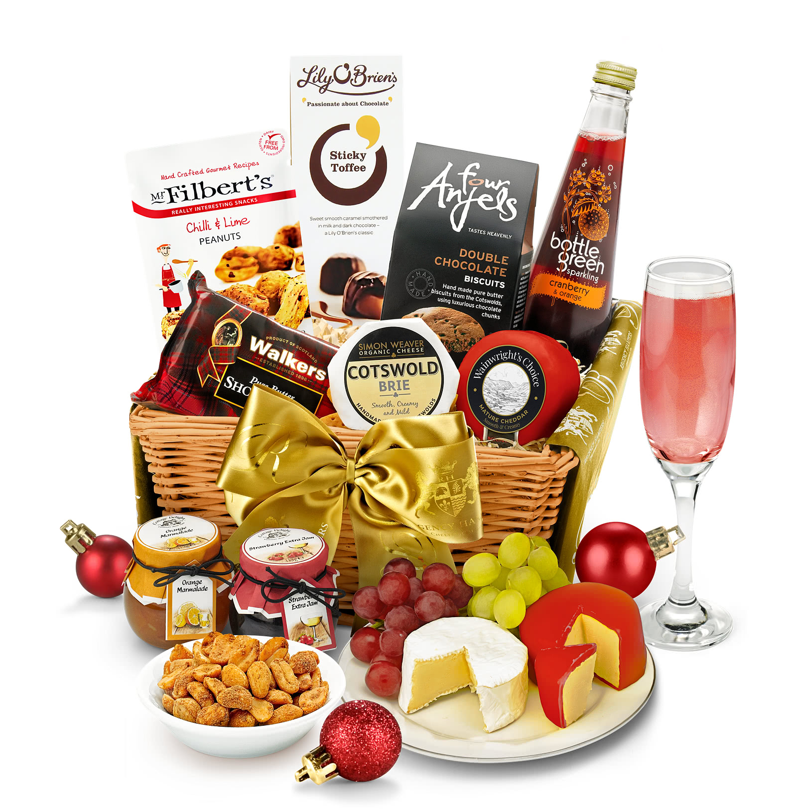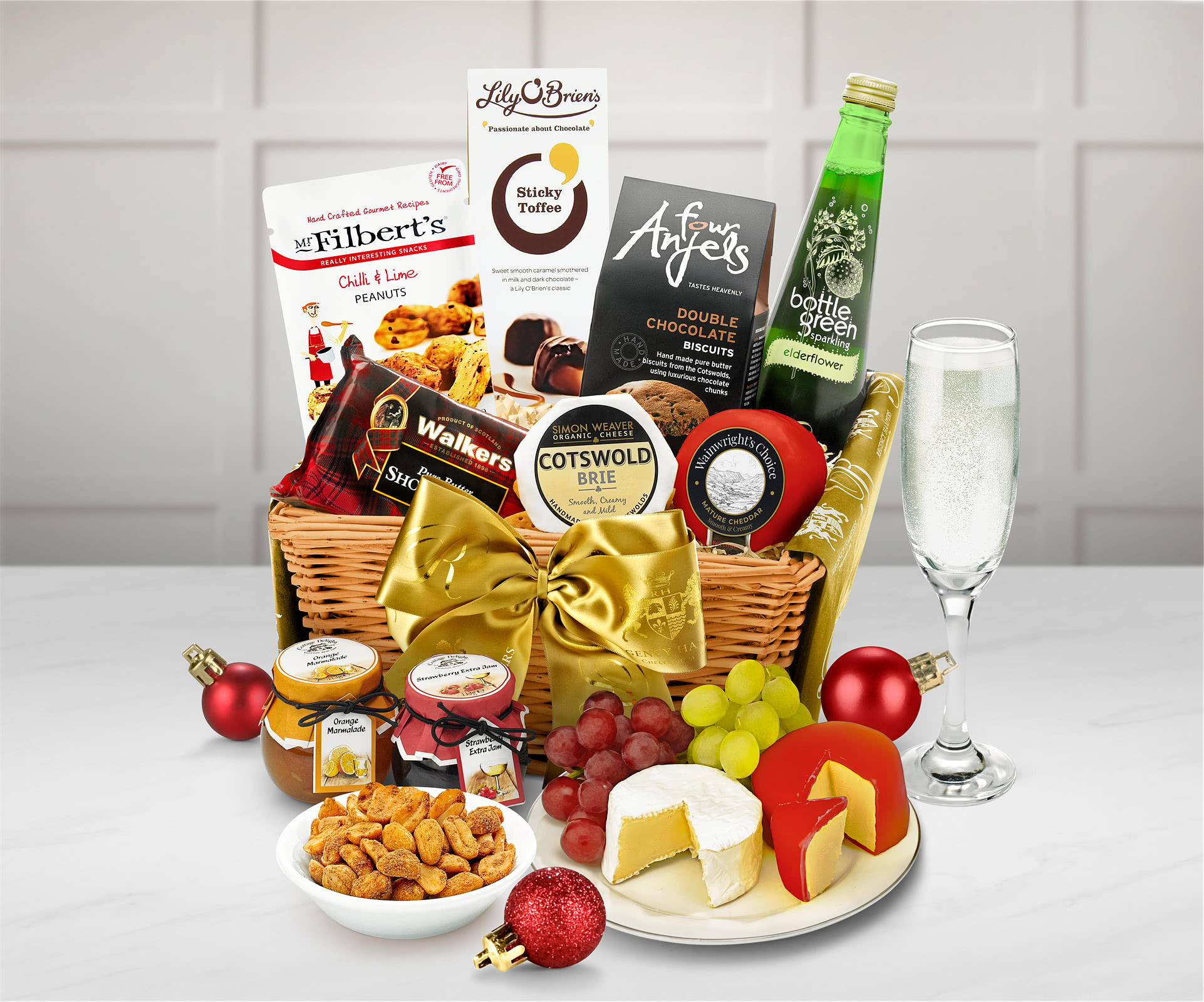 Christmas Tipples without the Alcohol: For an alcohol-free festive option, we've packed this hamper with the Bottlegreen Elderflower Sparkling Pressé. It sits right in the middle of the hamper, giving a floral taste to match the holiday sweets and balance the savoury treats.