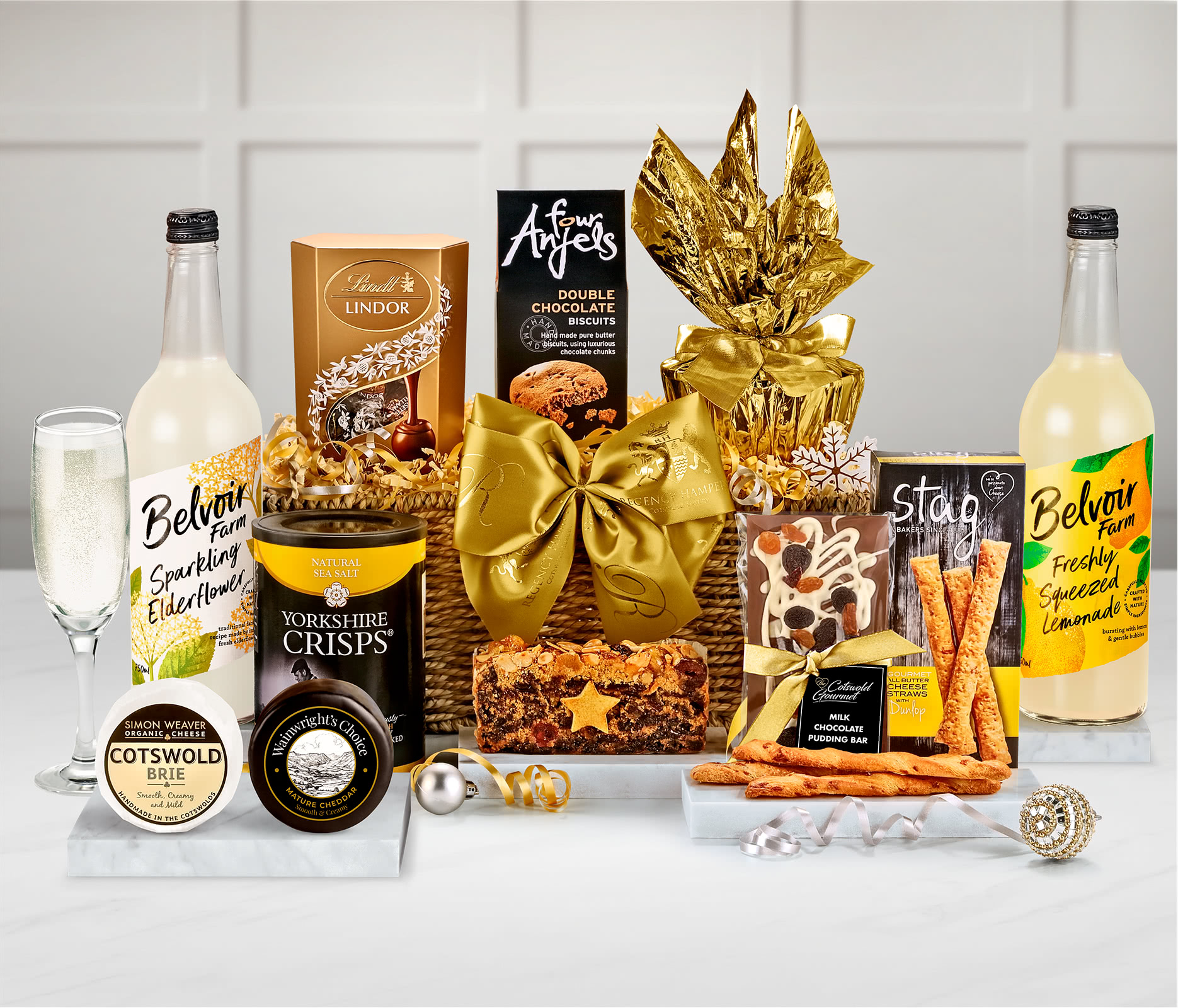 Gourmet Winter Delicacies: Savour an exceptional selection of artisan treats, from Simon Weaver's Organic Single Gloucester to Wainwright's Vintage Mature Cheddar. Complemented by traditional Christmas pudding, luxury fruit cake, and Lindt's finest Swiss chocolate truffles, this collection delivers authentic festive flavours alongside Yorkshire crisps and double chocolate biscuits.