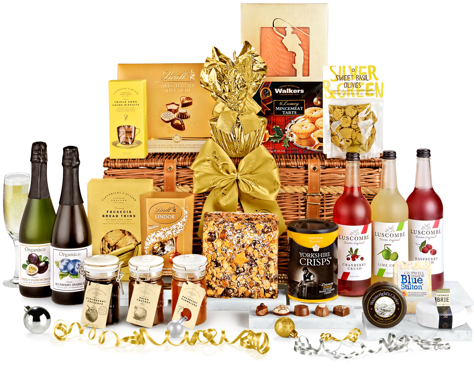 Artisan British Gourmet Selection: The hamper also holds a variety of British festive delicacies. Enjoy smoked salmon from Severn & Wye, three cheeses from respected makers, and a fruit cake topped with shiny jewel-like pieces from The Original Cake Co. Of course, you'll also find traditional Christmas pudding and mincemeat tarts.