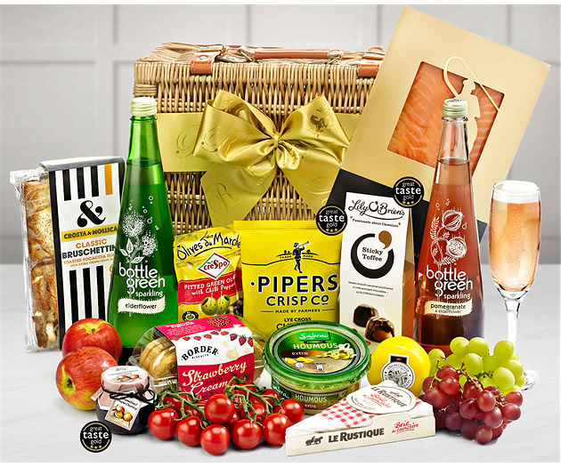 A beautiful gift hamper packed with delicious picnic food and drink including two bottles of sparkling and refreshing Bottlegreen Presses: Elderflower and Pomegranate & Elderflower. We also include a selection of fresh fruit with apples and grapes as well as fresh tomatoes to accompany such savoury delights as Premium Smoked Salmon from the Severn & Wye smokery, Sabra Houmous and Pitted Green Olives with Chilli Peppers from Crespo. Two fine cheeses including a smoked Mature Cheddar Truckle from Snowdonia and Le Rustique Brie are accompanied by Caramelised Onion Chutney as well as Oregano Crostini and Pipers Cheddar & Onion Crisps. Sweet treats to complete this wonderful picnic hamper of fine produce include White Chocolate & Strawberry Cookies and a pack of Lily O'Brien's Award Winning Sticky Toffee Chocolates.