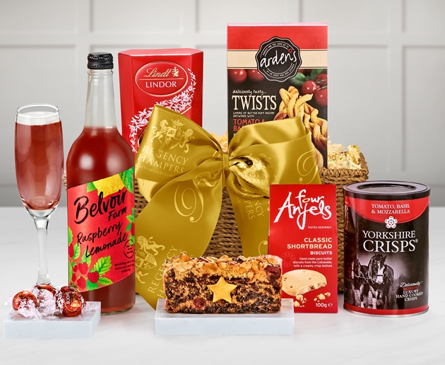 This stylish open willow tray contains a refreshing alcohol-free Organic Raspberry Crush. This sparkling fruit presse adds fizz to any special occasion while the delightful range of food treats makes it an ideal soft-drink food hamper. Savoury food treats in this Beaufort Hamper with Alcohol-Free Presse include Arden's Tomato & Basil Puff Pastry Twists plus a packet of tasty Tomato, Basil and Mozzarella flavoured Yorkshire Crisps. For sweet treats we provide Four Anjels delightful Luxury Cotswold Shortbread and a delicious Fruit & Nut Slab Cake with Marzipan Star & Icing Sugar Dusting from the Cotswold Gourmet. Finally we add a delicious selection of Lindt Lindor Milk Chocolate Truffles that are sure to appeal to any chocolate lover who receives this charming gift hamper. Remember to select the ideal delivery date when you place your order for this stylish food hamper when you can also add your own personalised greetings message.