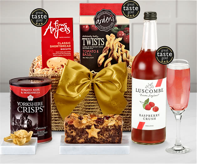 An ideal alcohol-free present containing a delightful bottle of sparkling fruit presse as the soft drink option in this popular Clarendon Hamper. The attractive seagrass tray also contains an excellent selection of savoury and sweet items for any special occasion. Our Clarendon Hamper with Alcohol-Free Presse includes a bottle of Luscombe Organic Raspberry Crush, a refreshing fruit presse that will add fizz to any festive event plus a range of excellent edible gifts. For savoury treats we add Arden's Tomato & Basil Puff Pastry Twists plus a packet of Tomato, Basil and Mozzarella-flavoured Yorkshire Crisps that go so well with the non-alcoholic Luscombe Fruit Presse. Sweet items include Cotswold Luxury Shortbread from Four Anjels and a rich Fruit & Nut Slab Cake adorned with a marzipan star and icing sugar dusting from The Cotswold Gourmet. Gifts from Regency Hampers are beautifully packed and presented. This Clarendon Hamper in its elegant seagrass tray arrives decorated with a golden hand-tied ribbon. Choose the most suitable delivery date for your gift when you place your order when you can add your own personalised message.