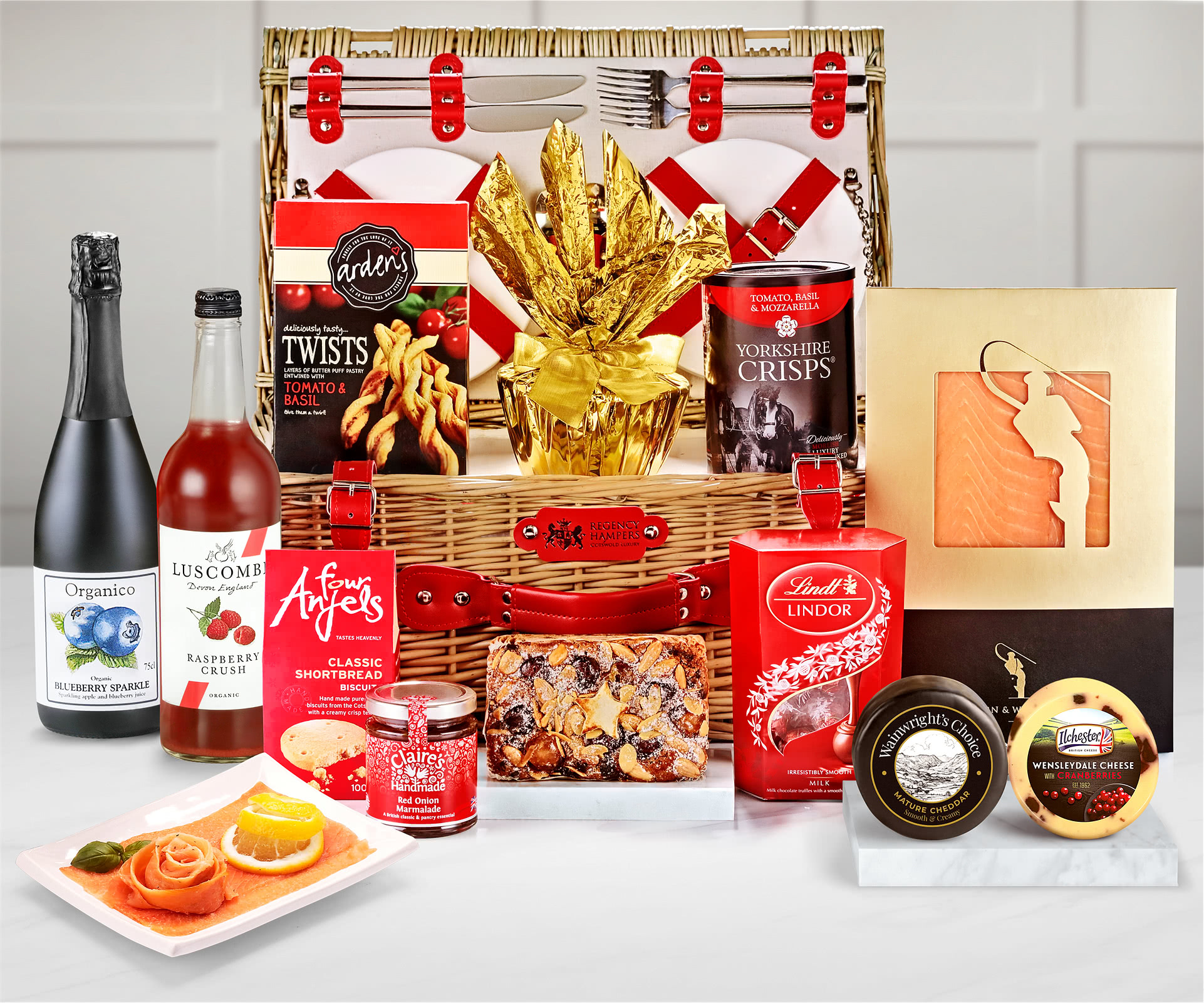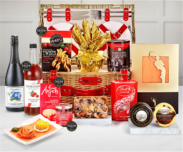 This Henley fitted picnic basket is a fine gift hamper, complete with picnic plates and cutlery, containing cheese, salmon and many other delightful gifts including two sparkling fruit presses. The refreshing soft drinks are Luscombe's Organic Raspberry Crush Sparkling Presse and a bottle of Blueberry Sparkle from the Organic Collection. Savoury delights include Severn & Wye Premium Smoked Salmon plus two award-winning British cheeses: Select Extra Mature Cheddar Truckle from Snowdonia and Simon Weaver's Organic Cotswold Brie. Further savoury gifts include Claire's Handmade Red Onion Marmalade plus packets of Arden's Tomato & Basil Puff Pastry Twists and Tomato, Basil & Mozzarella Yorkshire Crisps. Sweet treats feature Four Anjels Cotswold Luxury Shortbread, a Cotswold Gourmet Fruit & Nut Loaf Cake plus a delicious Strawberry Steamed Pudding and Lindt Chocolate Truffles. Select the best date for delivery when you order this Henley Fitted Picnic Gift Hamper with Alcohol-Free Presses and you can add your own greetings message.