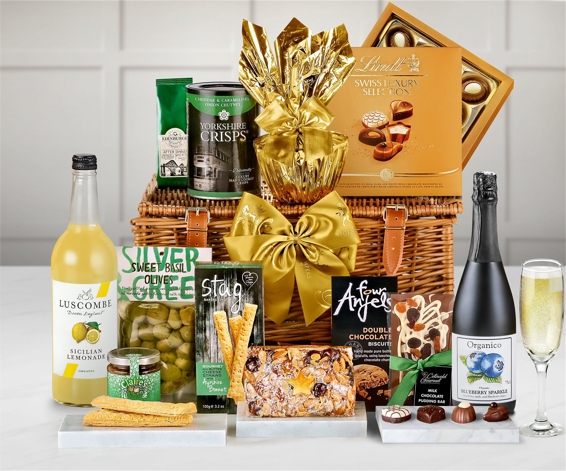 This large wicker basket is an excellent non-alcoholic luxury picnic set full of food and drink treats including Luscombe?s Organic Lime Crush Sparkling Press? and Blueberry Sparkle from The Organic Collection. For savoury delights we include Silver & Green Sweet Basil Olives, Stag?s All Butter Cheese Straws Sweet Chilli & Lime Yorkshire Crisps and a jar of Claire's Handmade Old English Apple Chutney. Then for sweet treats in this non-alcoholic Knightsbridge Gift Hamper luxury picnic set we add Chocolate Brownie Luxury Butter Biscuits, a delicious Fruit & Nut Loaf Cake from The Cotswold Gourmet and a traditional Gold Crown Christmas Pudding. Chocolate lovers will be delighted by the Lindor Assorted Swiss Chocolate Truffles by Lindt the master Swiss chocolatiers as well as a Stas Chocolate Bar and Elizabeth Shaw Dark Chocolate Mint Flutes complemented by Edinburgh After Dinner Coffee. Simply choose the delivery date for your handcrafted non-alcoholic Knightsbridge Gift Hamper luxury picnic set with its hand-tied ribbon when you place your order and remember to add a personal greetings message.