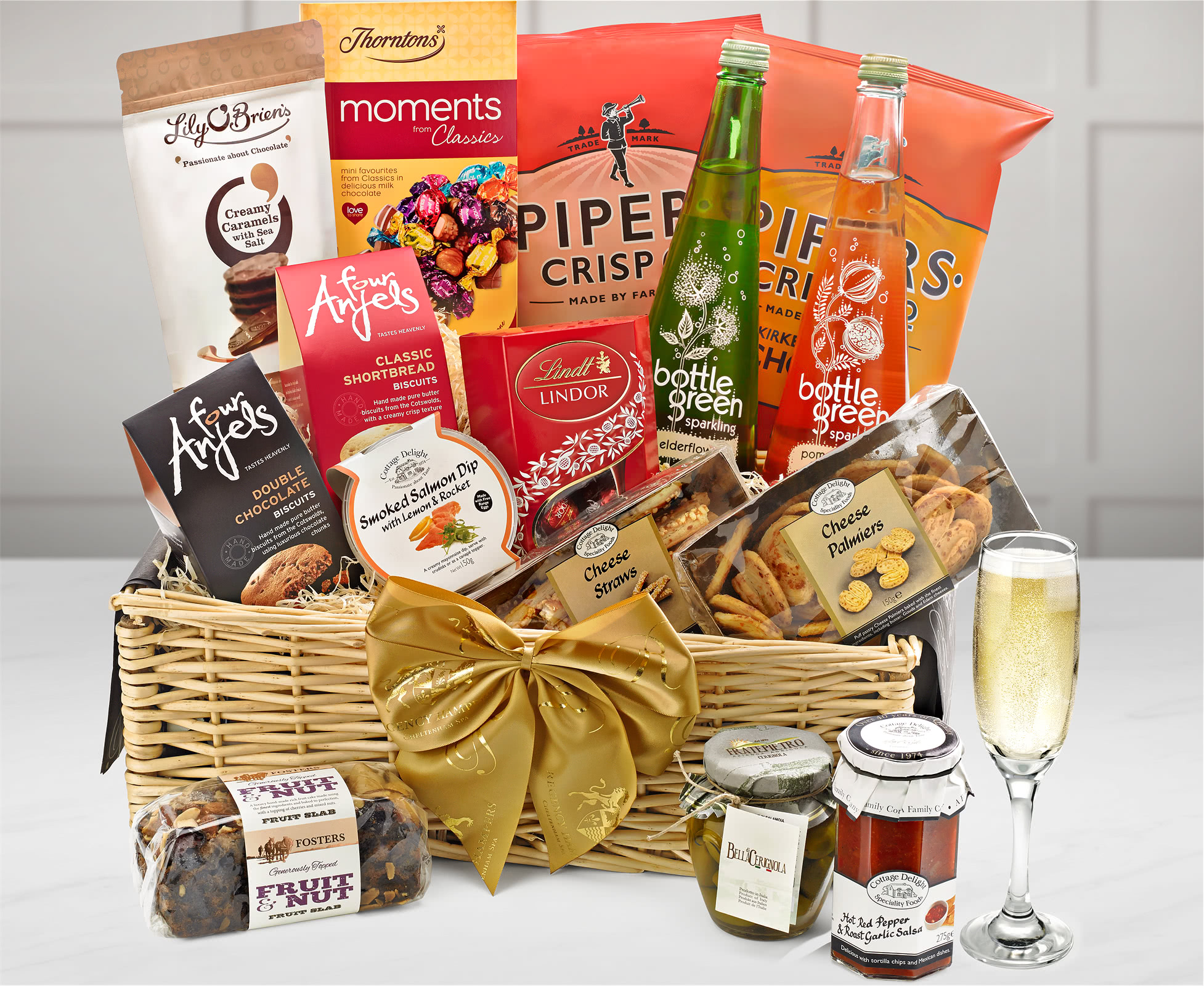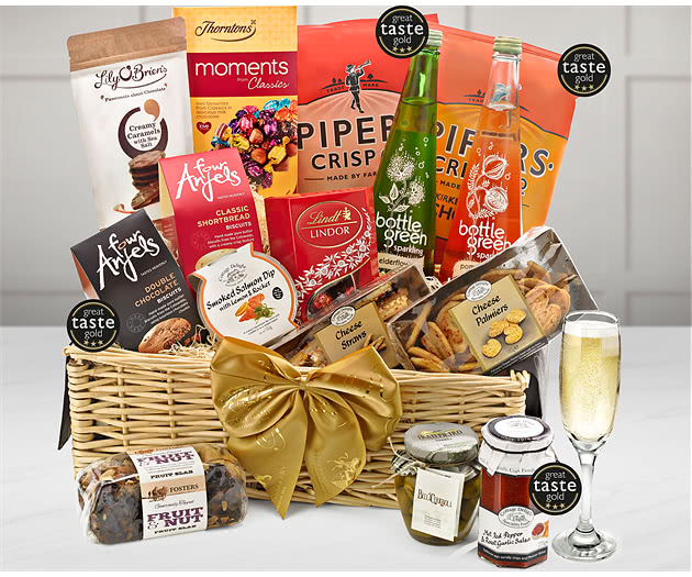 A great way of saying thanks for all the hard work and a fine way of motivating your team, this Large Office Share Gift Hamper with Fruit Presses is packed with excellent produce that can be shared around the office. Inside this elegant wicker basket you'll find such perfect presents of food and drink as two bottles of Sparkling Fruit Presse from Bottlegreen: Sparkling Elderflower and Sparkling Pomegranate & Elderflower. For a stylish office picnic lunch we also include Smoked Salmon Pate, delicious Olives and Red Pepper Salsa together with Cheese Straws and Cheese Palmiers from Cottage Delight. And for extra snacks to share, we offer you Pipers Sweet Chilli and Chorizo-flavoured Crisps. For sweet temptation we add Four Anjels Cotswold Luxury Shortbread and Double Chocolate Biscuits as well as Fosters Luxury Topped Fruit & Nut Cake. And to complete this beautiful basket of presents to share we provide delicious boxes of Thornton's Classic ‘Moments' Chocolates, Lindor Milk Chocolate Truffles and Lily O'Brien's Creamy Irish Caramels.
