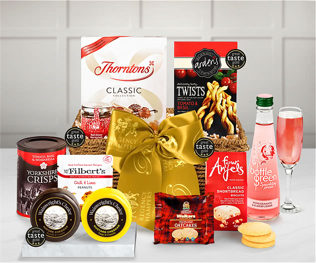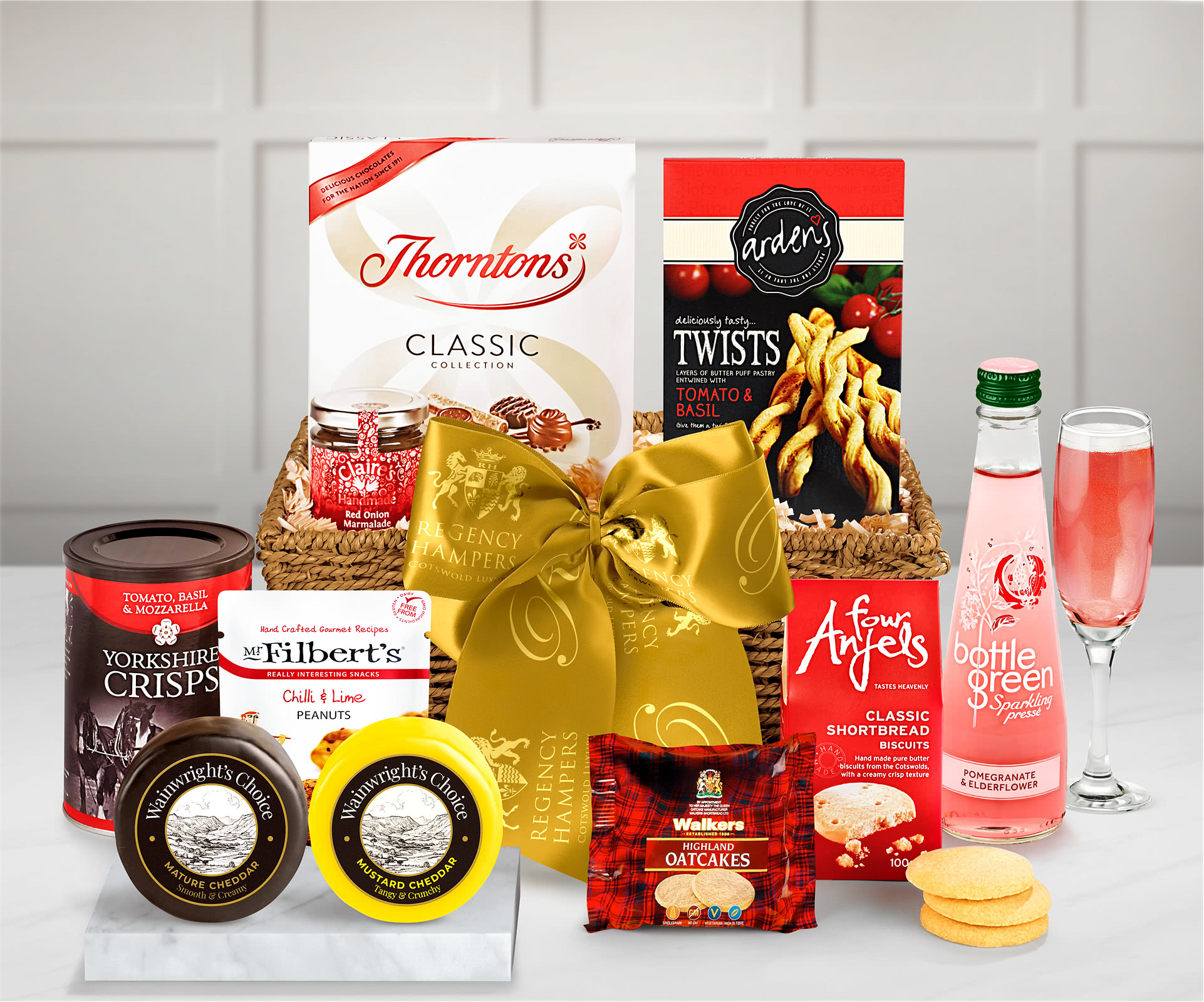 This charming Oxford Hamper with Alcohol-Free Presse is presented in a stylish seagrass tray packed with wonderful food and drink treats including a refreshing bottle of Pomegranate & Elderflower Sparkling Presse from Bottlegreen. In addition to this sparkling fruit presse this Oxford Hamper contains two great British cheeses with a Cheddar truckle from Snowdonia and a Wensleydale with Cranberry from Ilchester. Further savoury delights include Tomato, Basil & Mozzarella flavoured Yorkshire Crisps, The Dormen's ‘Perfectly Scrumptious' Spicy Peanuts Walkers Highland Oatcakes and a delightful jar of Claire's handmade Red Onion Marmalade. Sweet treats in this non-alcoholic Oxford Hamper include Four Anjels Cotswold Luxury Shortbread and a tempting box of Thornton's Classic Chocolate Assortment. Select the delivery date you require when you order this Oxford Hamper gift and remember to add your own personalised greetings message.
