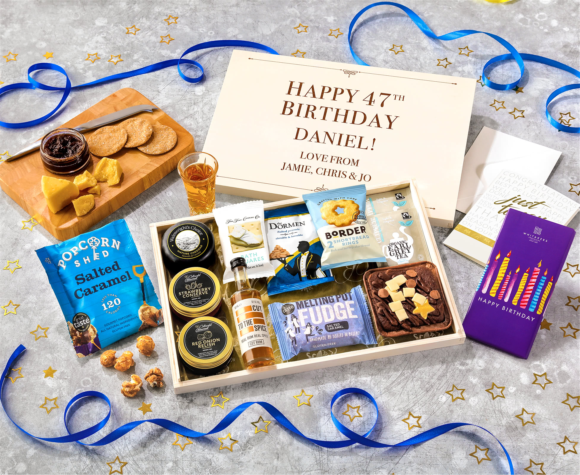 Birthday Biscuit Cheese & Cake Tea Time Letterbox Hamper With Spiced Rum: