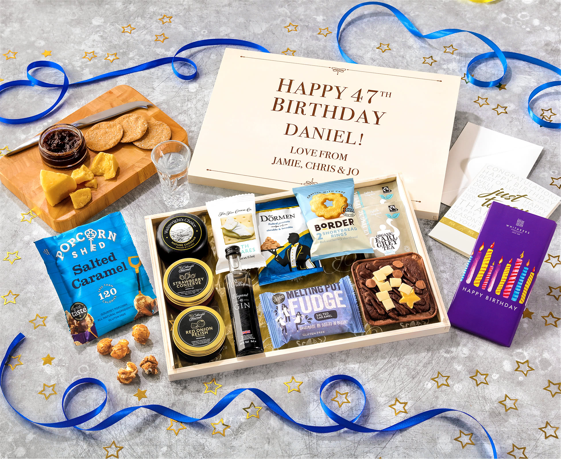 Birthday Biscuit, Cheese & Cake Tea Time Letterbox Hamper With Williams Gin