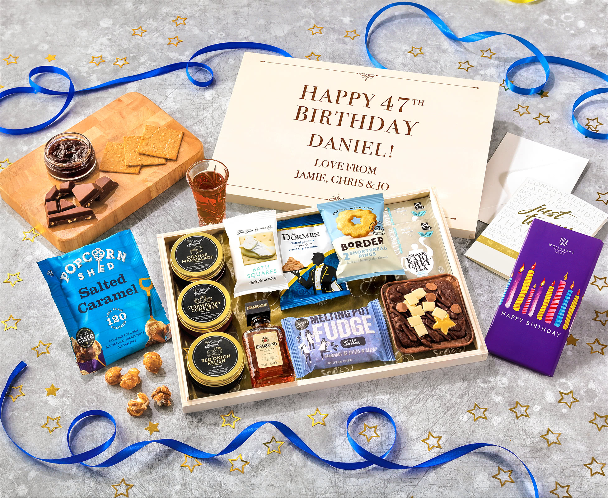 Birthday Tea Time Cake, Chocolate & Nibbles Letterbox Hamper With Disaronno Liqueur