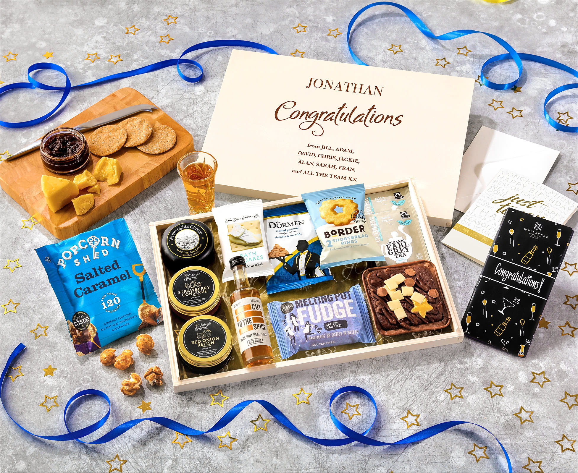 Congratulations Biscuit, Cheese & Cake Tea Time Letterbox Hamper With Spiced Rum