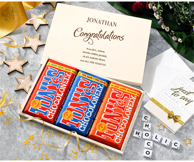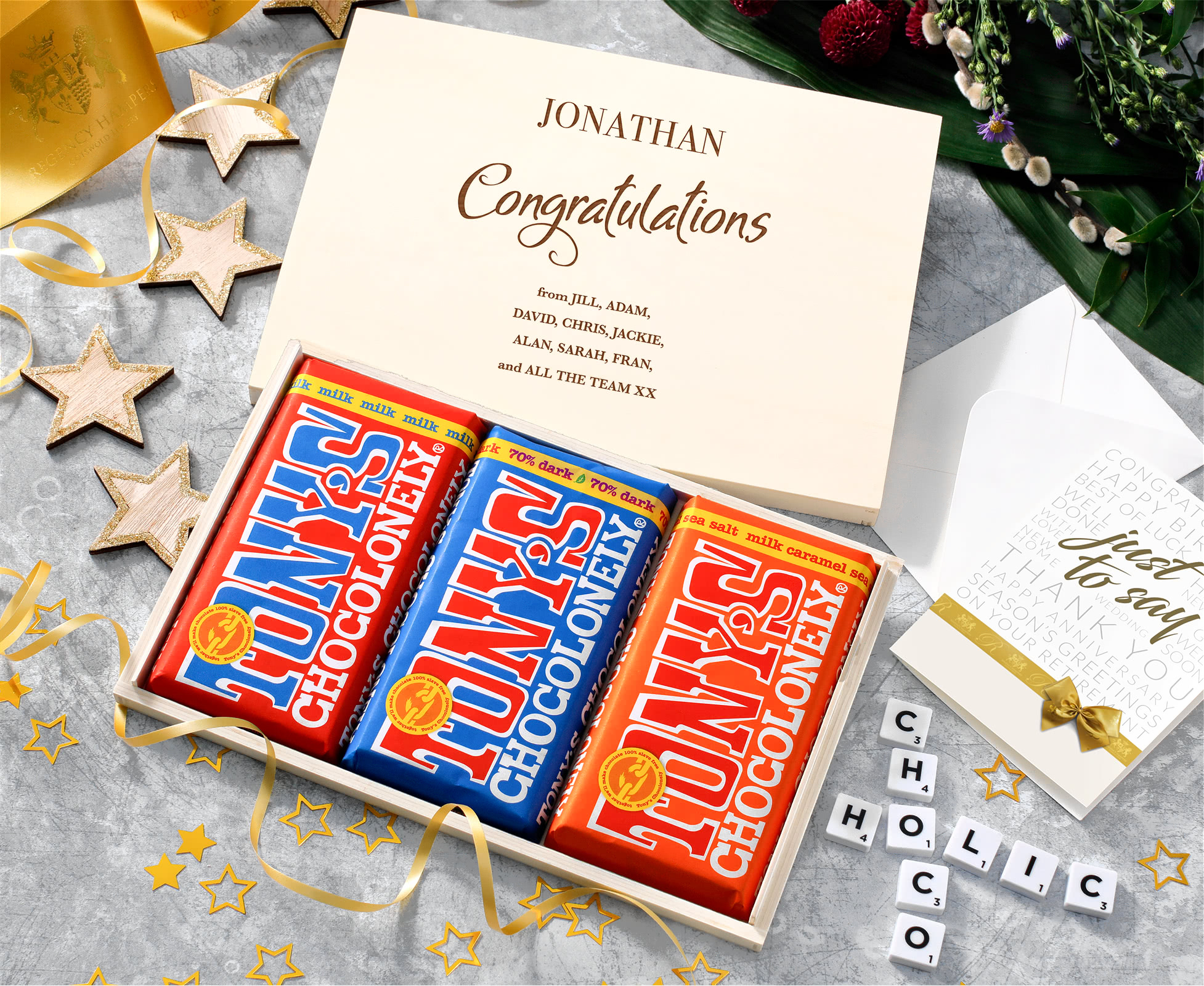Premium Chocolate Selection: This gourmet gift basket boasts three exceptional bars from Tony's Chocolonely: creamy Milk Chocolate, intense Extra Dark Chocolate, and the indulgent Milk Caramel Sea Salt variety. Each bar is a testament to Tony's commitment to slave-free cocoa, and delivers distinctive flavours that chocolate enthusiasts will treasure.