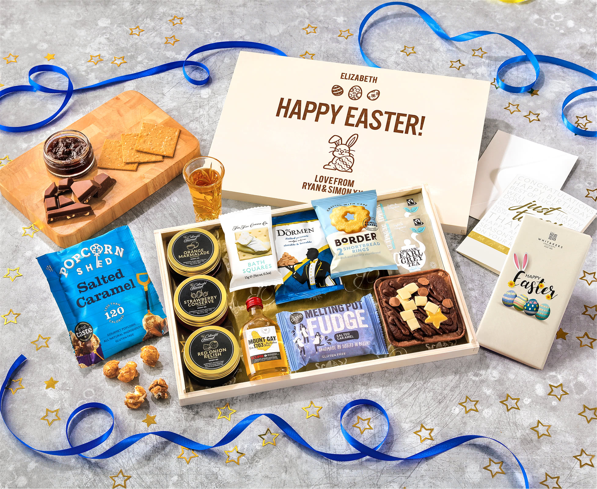 Easter Tea Time Cake, Chocolate & Nibbles Letterbox Hamper With Mount Gay Rum