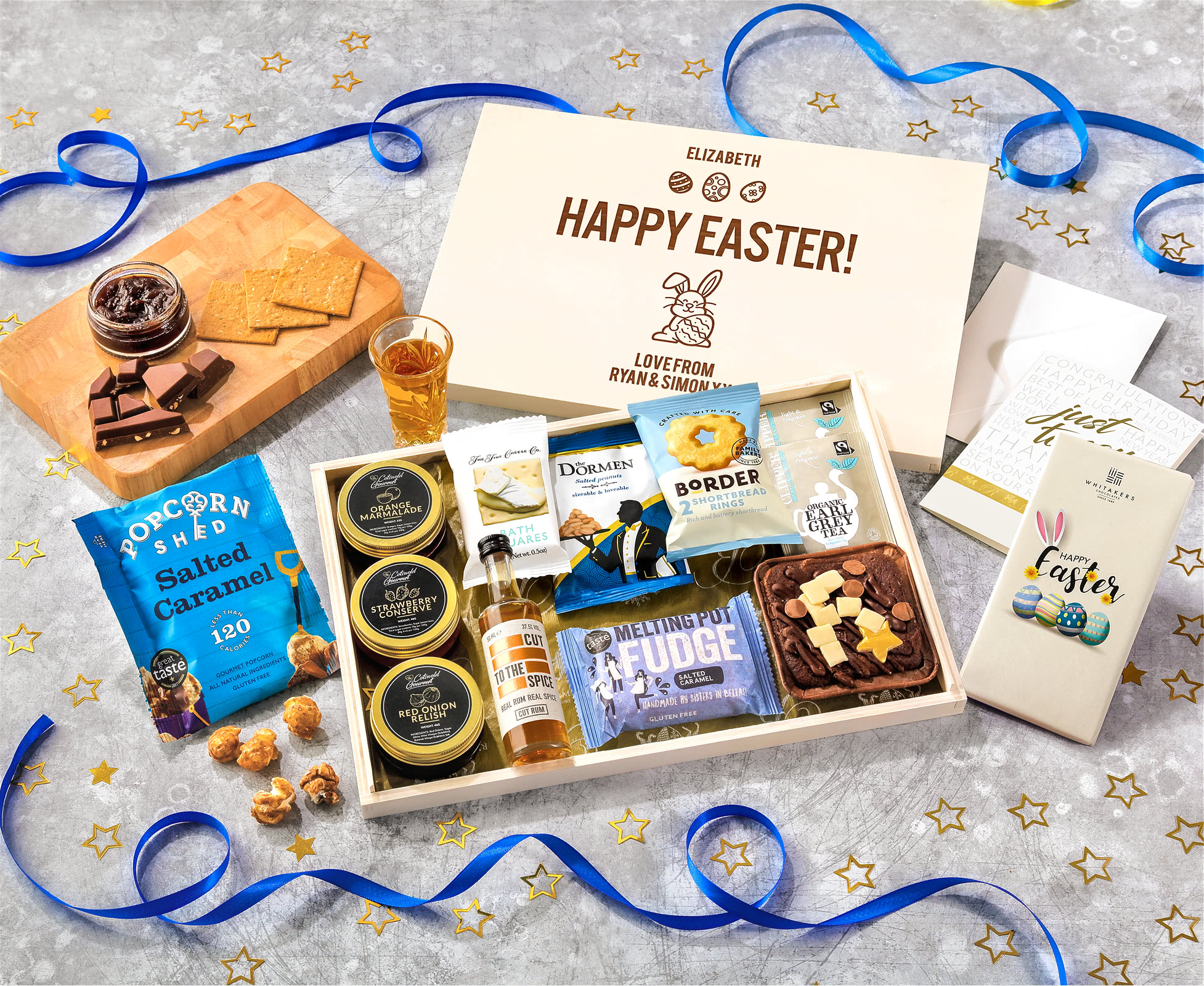 Easter Tea Time Cake, Chocolate & Nibbles Letterbox Hamper With Spiced Rum