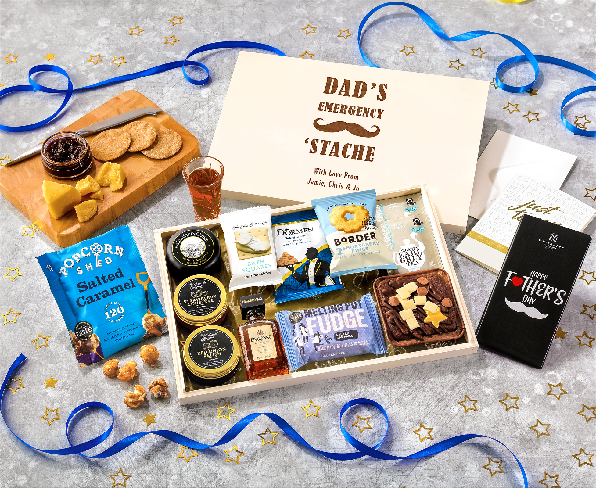 Artisanal Tea Time Indulgence: A delightful gift box bring together sophisticated flavour of Disaronno liqueur with premium teatime faire. Enjoy Wainwright's Choice Black Waxed Farmhouse Cheddar paired with Cotswold Gourmet Red Onion Relish and Bath Squares, for the ideal Cotswolds cheese course. The sweet delights accompanying the cheese include The Original Cake Company's Mini Square Chocolate Cake and Tony's Chocolonely Milk Chocolate Bar.