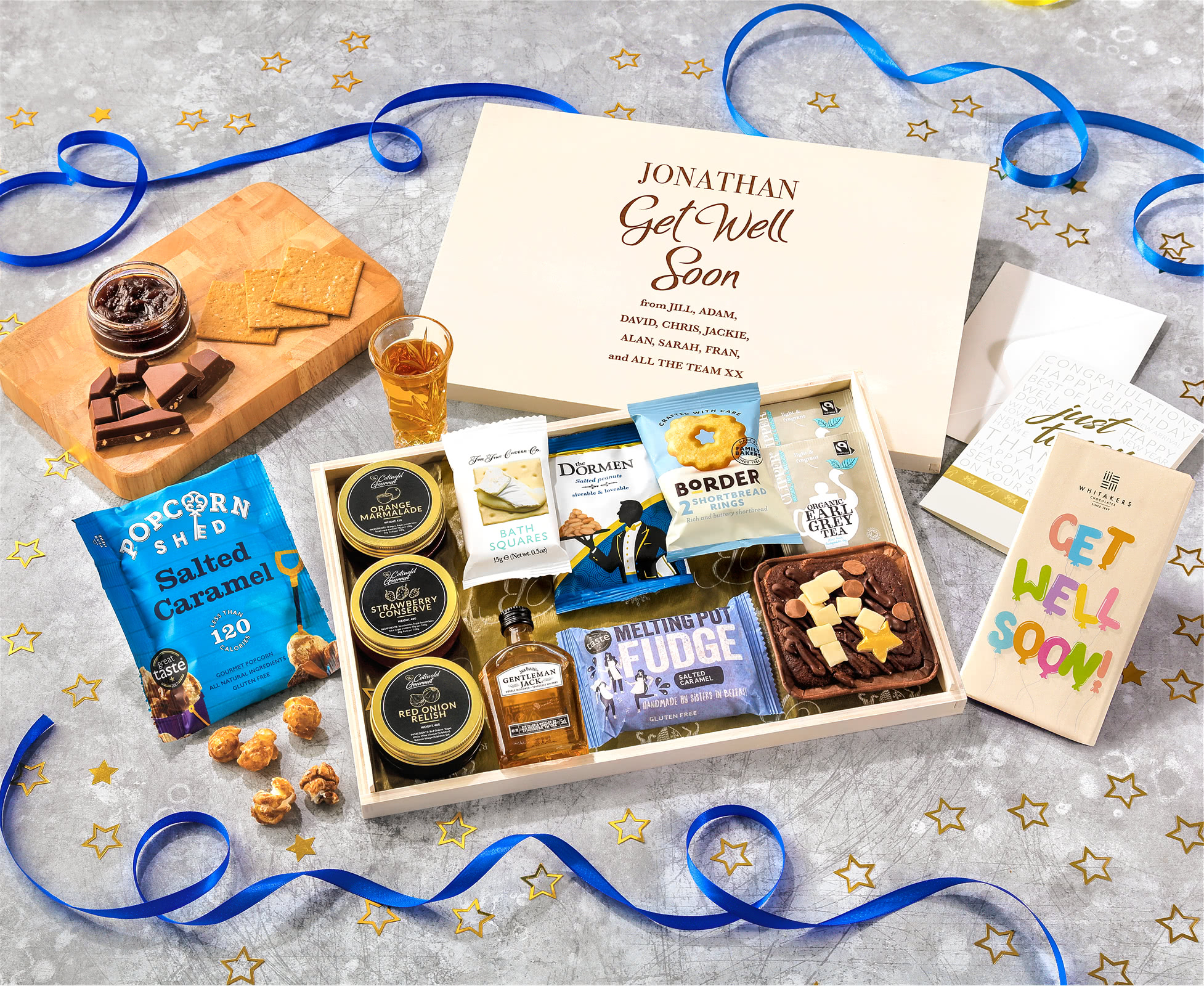 Get Well Soon Tea Time Cake, Chocolate & Nibbles Letterbox Hamper With Gentleman Jack Whisky