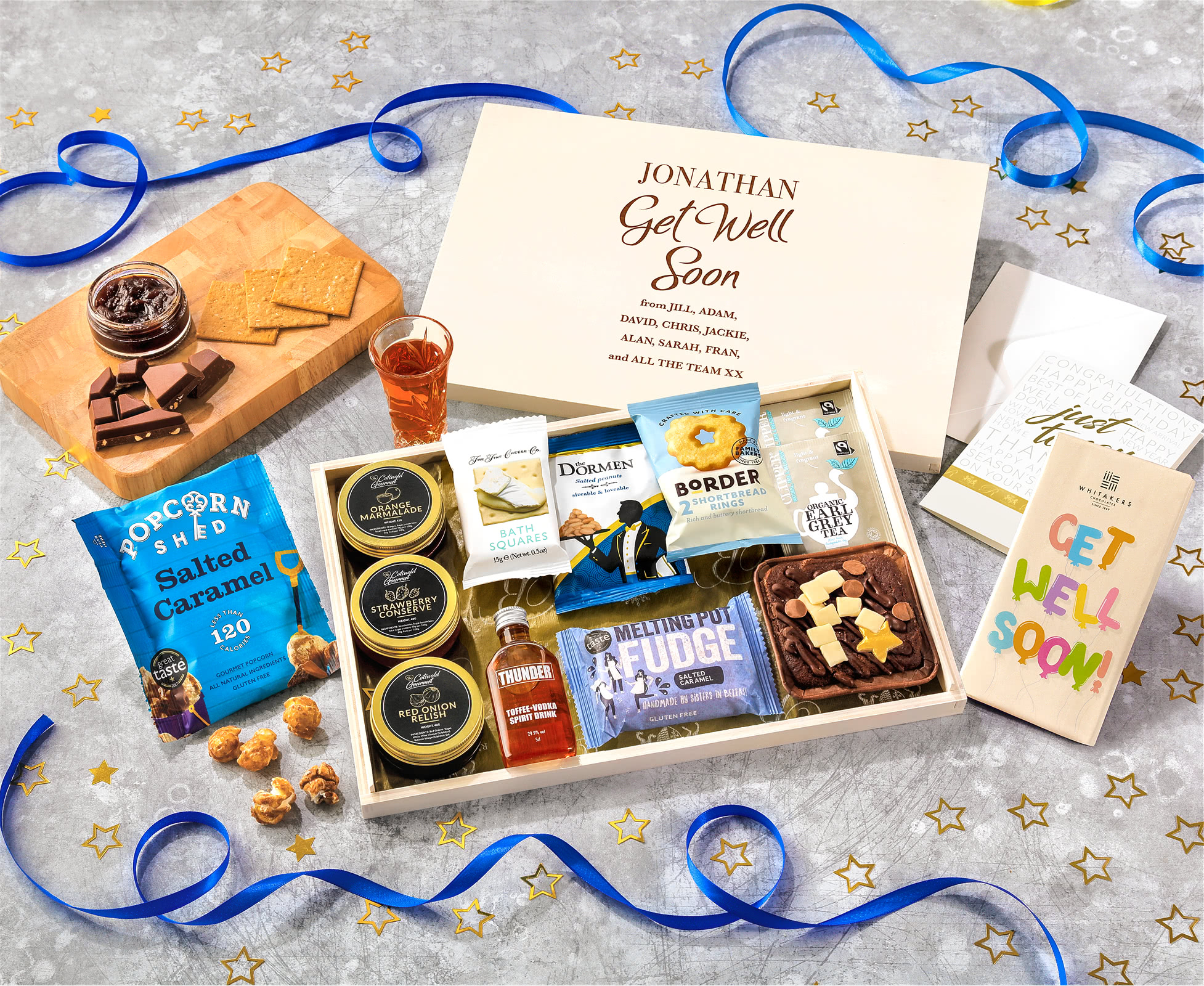Get Well Soon Tea Time Cake, Chocolate & Nibbles Letterbox Hamper With Toffee Vodka