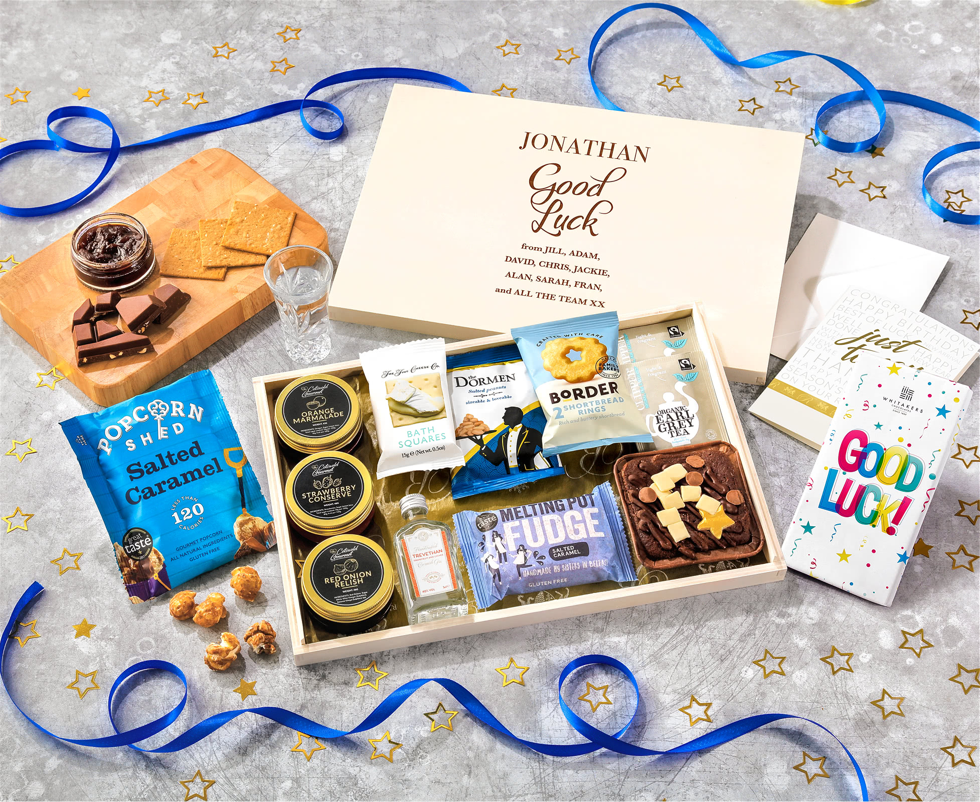 Good Luck Tea Time Cake, Chocolate & Nibbles Letterbox Hamper With Cornish Gin
