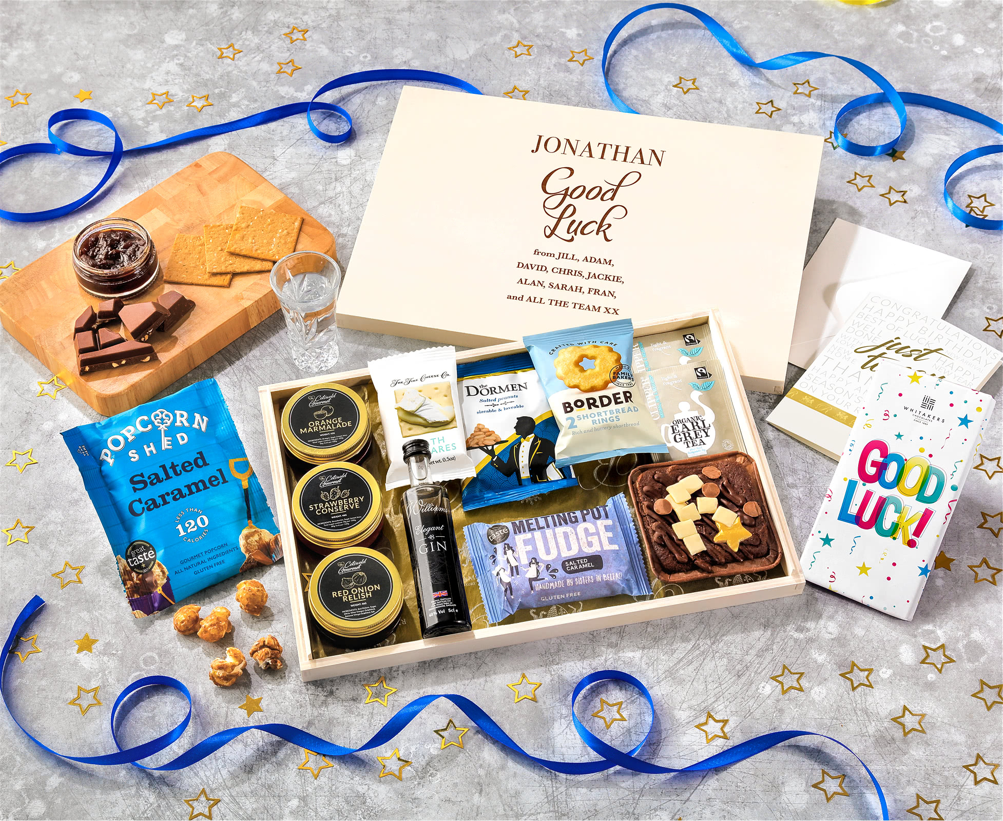 Good Luck Tea Time Cake, Chocolate & Nibbles Letterbox Hamper With Williams Gin