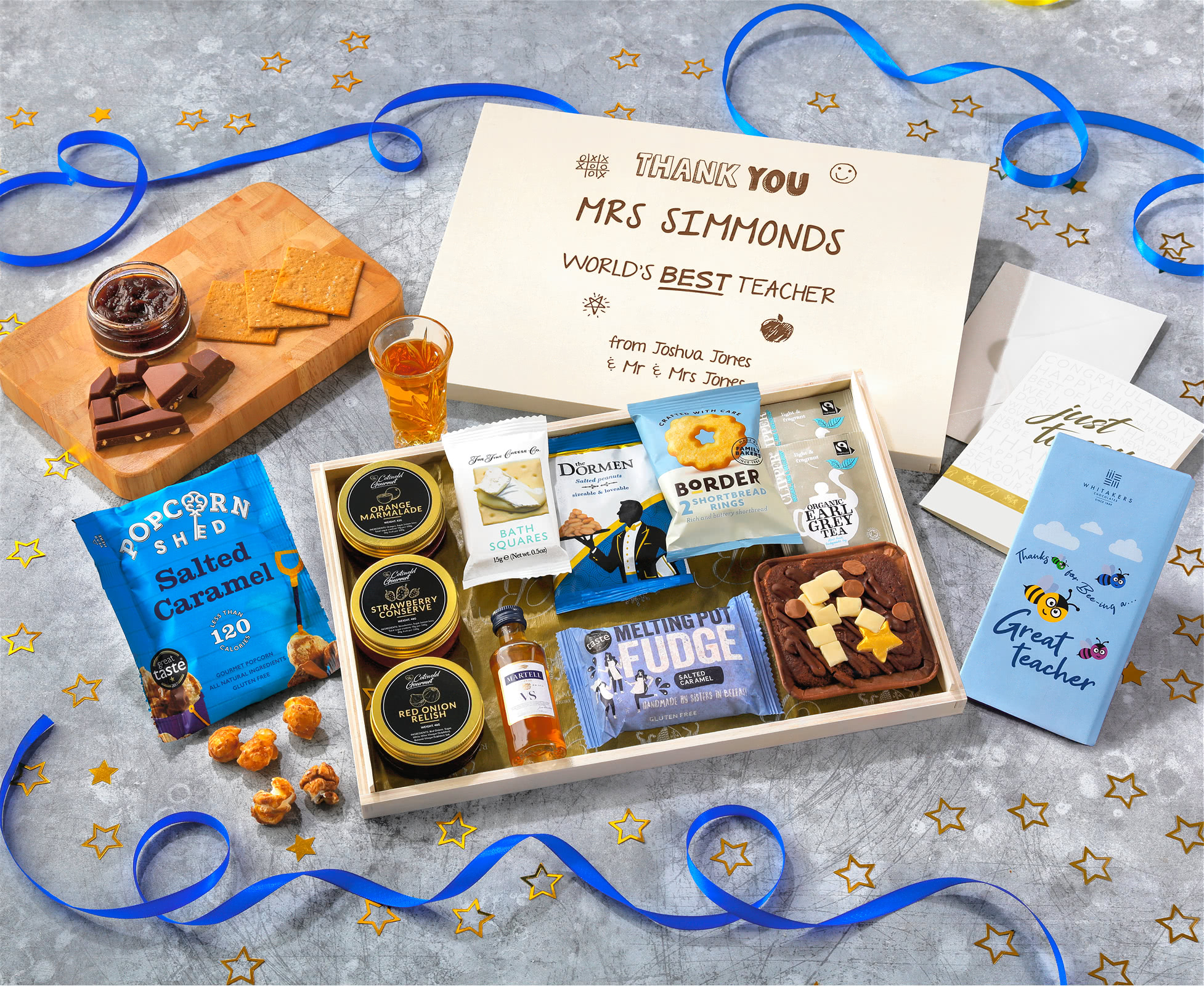 Indulgent Sweet & Savoury Selection: This thoughtful hamper combines premium treats, including The Original Cake Company's mini square chocolate cake, Tony's Chocolonely milk chocolate bar, and Melting Pot handmade salted caramel fudge. Alongside these sweet nibbles, you'll find savoury delights like Cotswold Gourmet red onion relish and The Fine Cheese Co Bath squares.