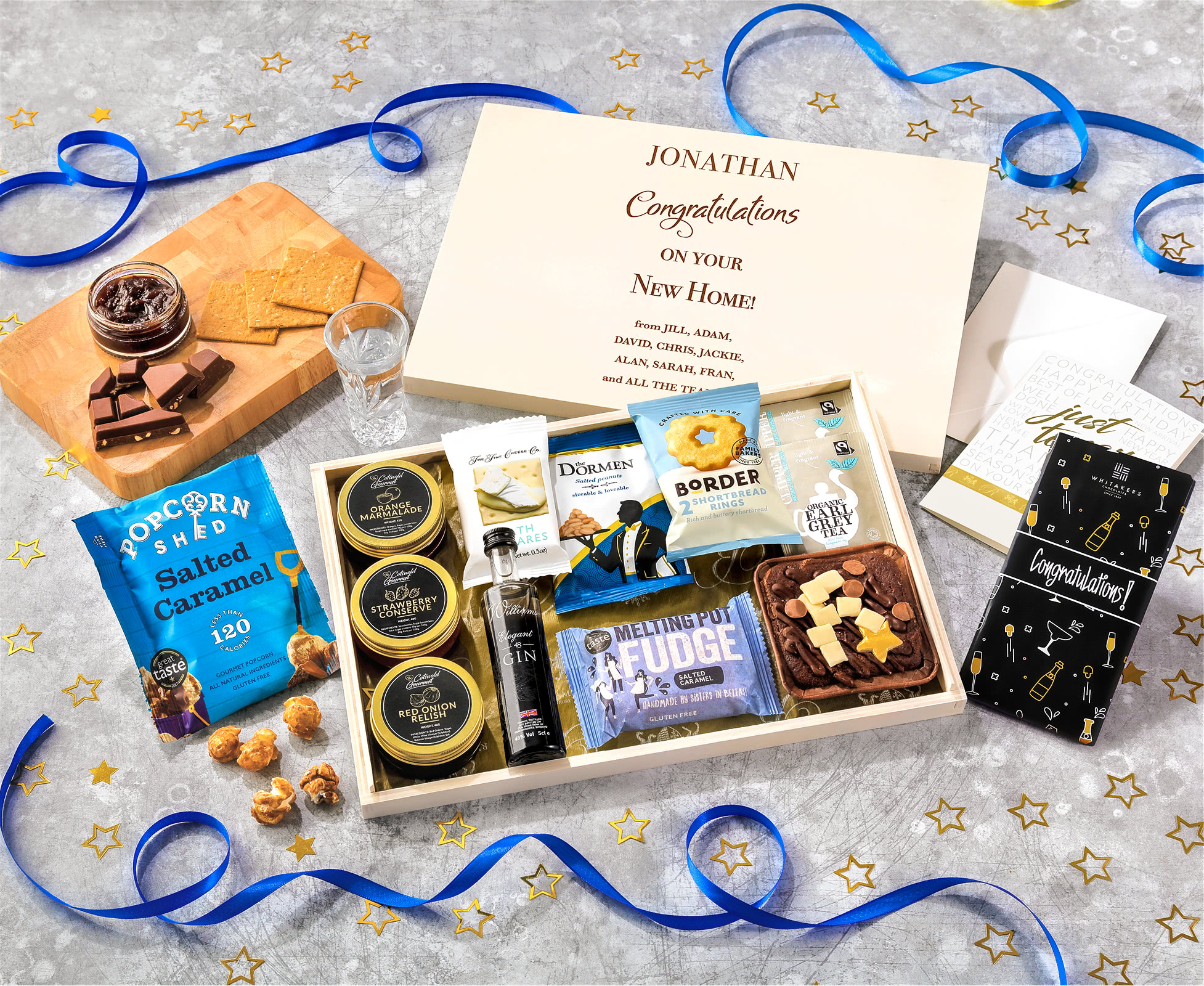 Housewarming Tea Time Cake, Chocolate & Nibbles Letterbox Hamper With Williams Gin