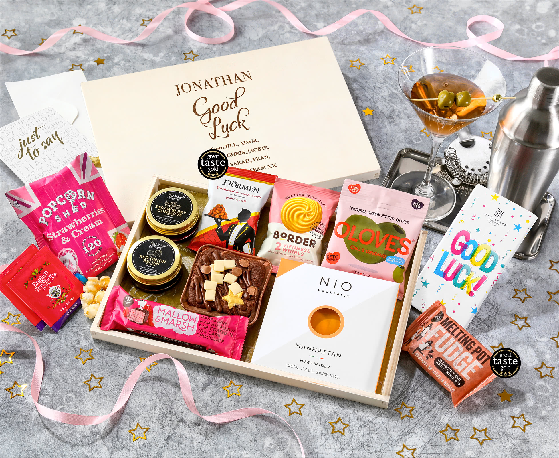 Premium Manhattan Experience: This sophisticated basket features a pre-mixed NIO Cocktails Manhattan, delivering authentic cocktail bar quality straight to your door. This expertly crafted drink pairs beautifully with gourmet accompaniments, including natural Italian olives and traditional dry roast peanuts.