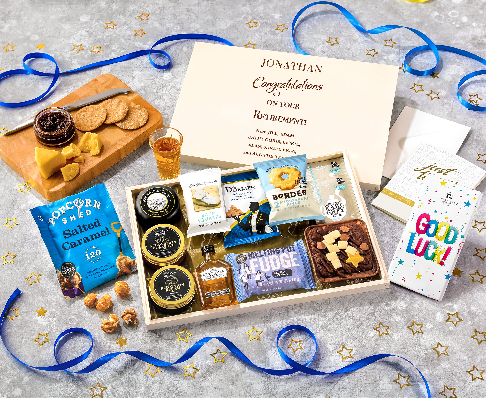 Retirement Biscuit, Cheese & Cake Tea Time Letterbox Hamper With Gentleman Jack Whisky