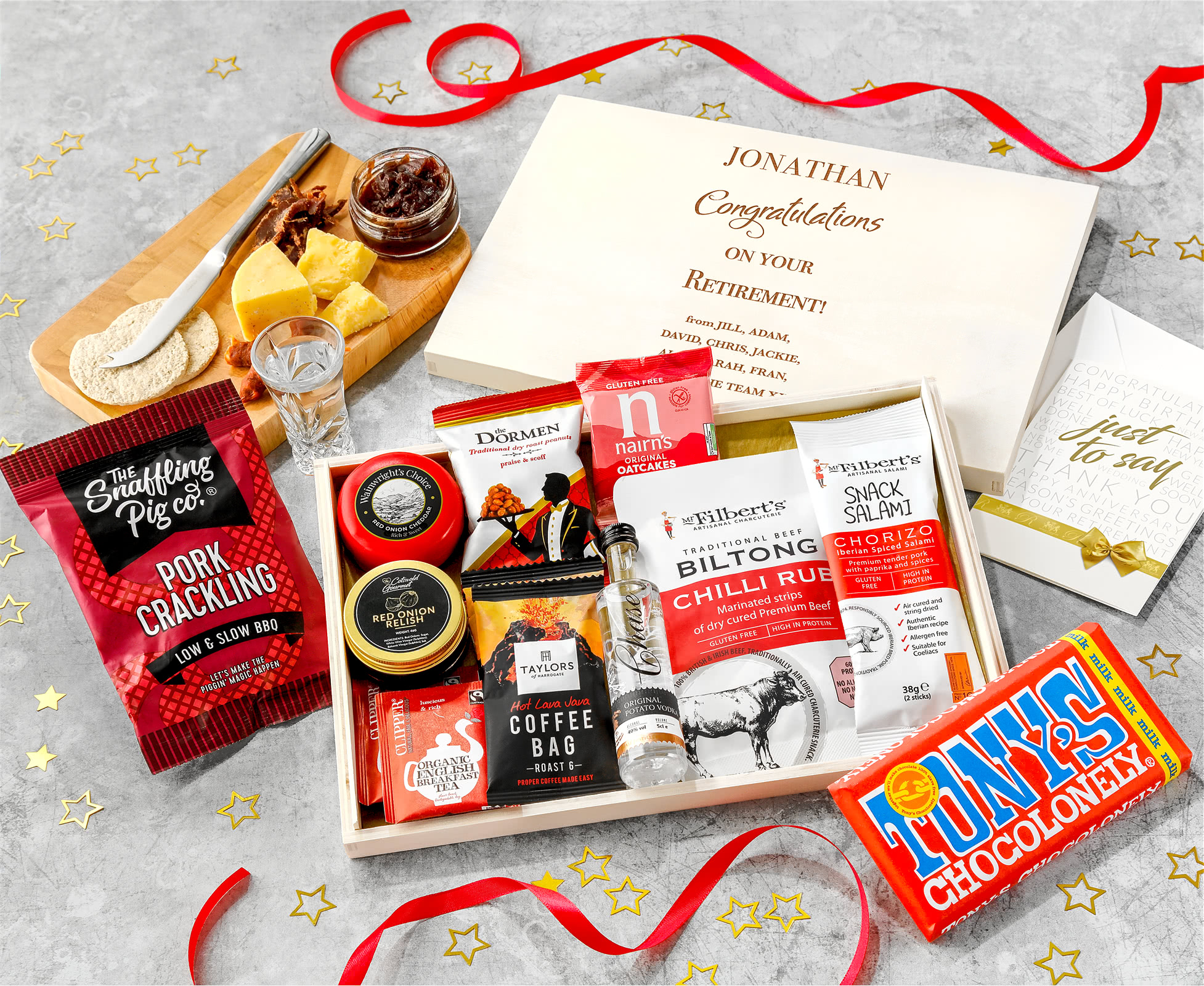 Exquisite Presentation: Impressively presented in a deep letterbox with a custom lid and a sturdy protective outer, this hamper is designed to wow. The contents have been chosen with care and constitute a mini banquet of sorts. In addition to the tasty snacks and smooth spirits, you'll also find premium Taylors Hot Lava Java coffee and splendid English Breakfast tea tucked inside this hamper, along with oatcakes, chorizo, and nuts.