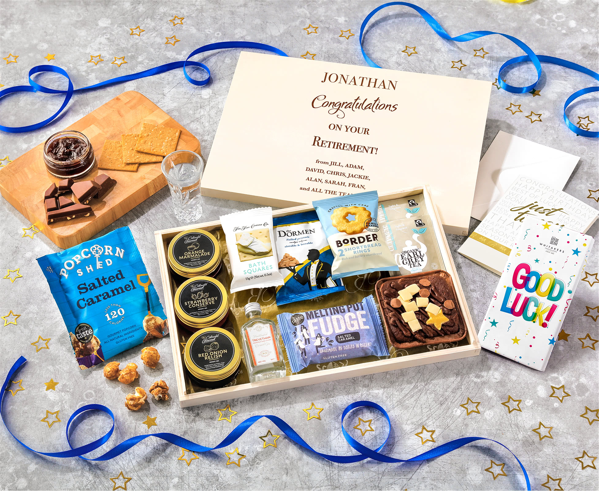 Retirement Tea Time Cake, Chocolate & Nibbles Letterbox Hamper With Cornish Gin