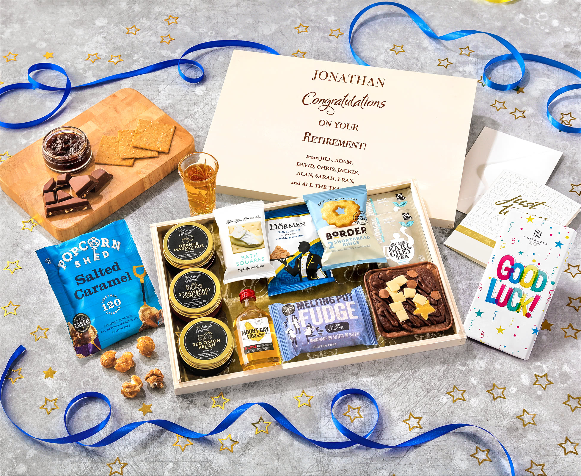 Retirement Tea Time Cake, Chocolate & Nibbles Letterbox Hamper With Mount Gay Rum