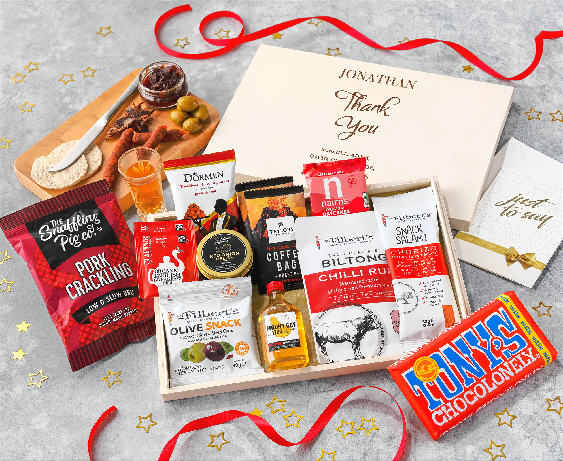 Premium Rum & Artisan Snacks Selection: This remarkable gift basket revolves around Mount Gay Eclipse Rum, an incredibly revered spirit from the Caribbean. It pairs perfectly with Filbert's Chilli Rub Premium Beef Strips and The Snaffling Pig's 'Hot to Trot' Habanero Pork Cracklings. These delicious savoury snacks artfully complement the smooth, golden rum.
