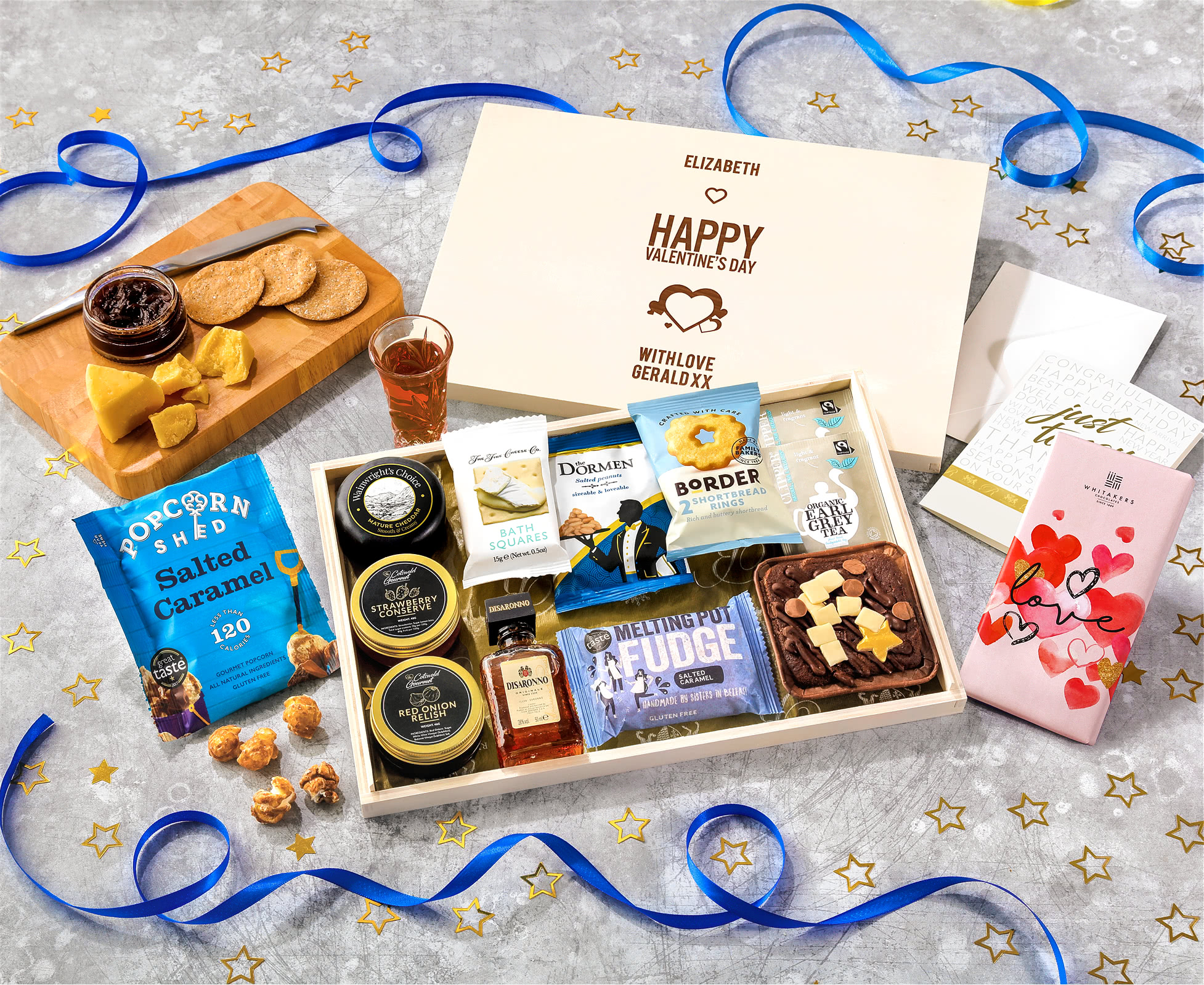 Valentine's Day Biscuit, Cheese & Cake Tea Time Letterbox Hamper With Disaronno Liqueur