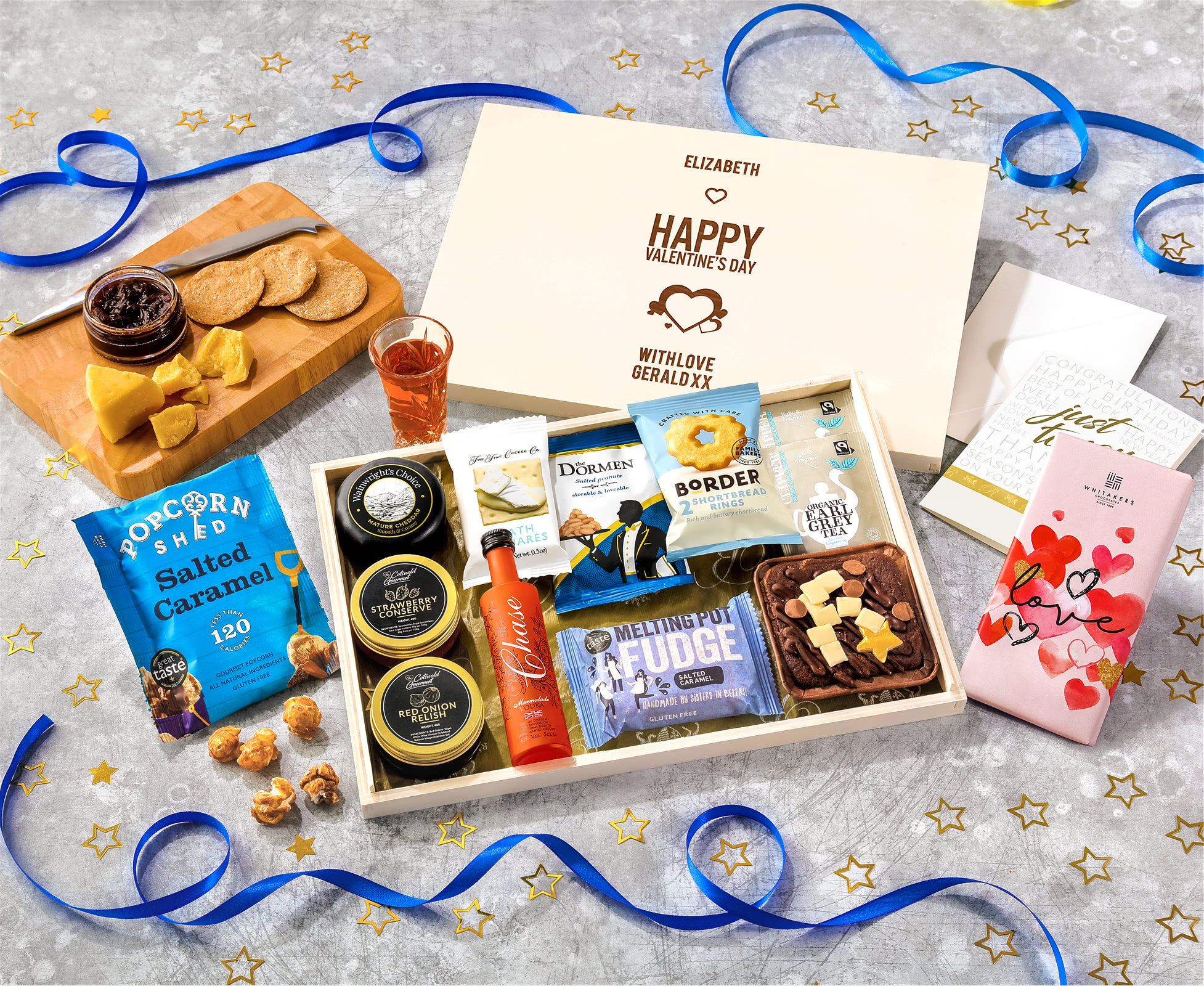 Valentine's Day Biscuit, Cheese & Cake Tea Time Letterbox Hamper With Marmalade Vodka