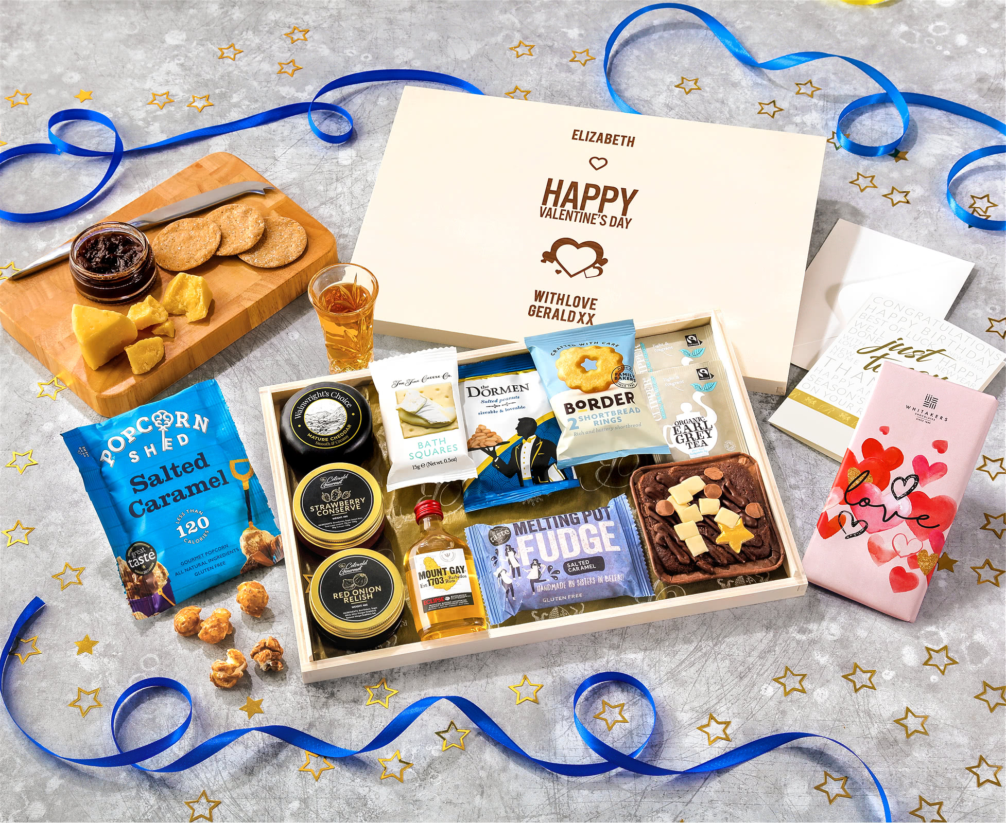 Valentine's Day Biscuit, Cheese & Cake Tea Time Letterbox Hamper With Mount Gay Rum