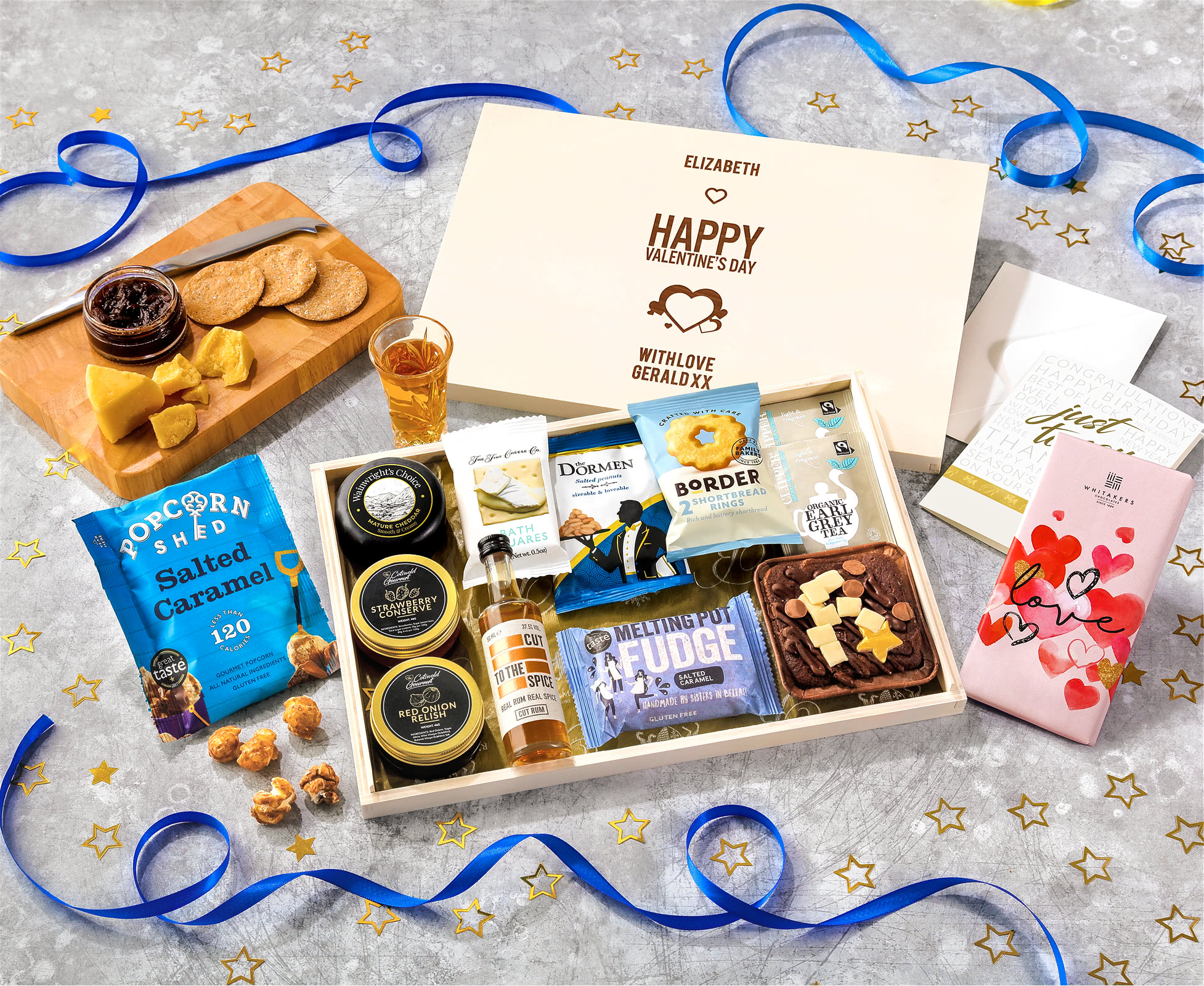 Valentine's Day Biscuit, Cheese & Cake Tea Time Letterbox Hamper With Spiced Rum