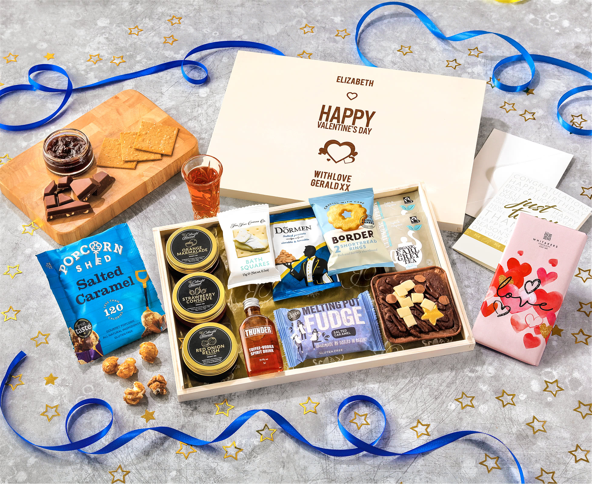 Valentine's Day Tea Time Cake, Chocolate & Nibbles Letterbox Hamper With Toffee Vodka
