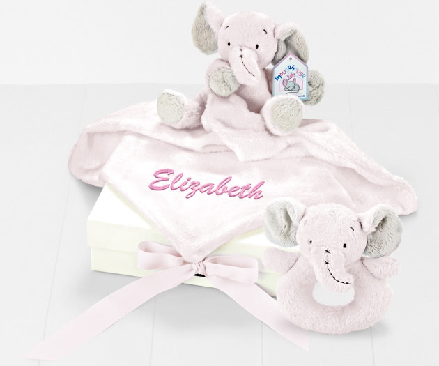 A pretty present for a baby girl in traditional pink and ivory colours, this attractive gift box tied with a pink ribbon contains a cosy comfort blanket and baby rattle to welcome a new child. Inside this pretty presentation box you'll find a delightfully soft comfort blanket plus a cute baby rattle which both feature a cuddly pink elephant from the MouseHouse toymakers. This soft toy blanket and rattle provide comfort and security to young babies who quickly grow attached to the furry soft animals they can hold and cuddle. Regency Hamper's baby gifts are beautifully packaged to make the best impression when they arrive. You can also add your own greetings message to make your present even more personal. Choose the most suitable date for delivery when you order this MouseHouse comfort blanket and ring rattle gift box which arrives decorated with an attractive hand-tied greetings ribbon.