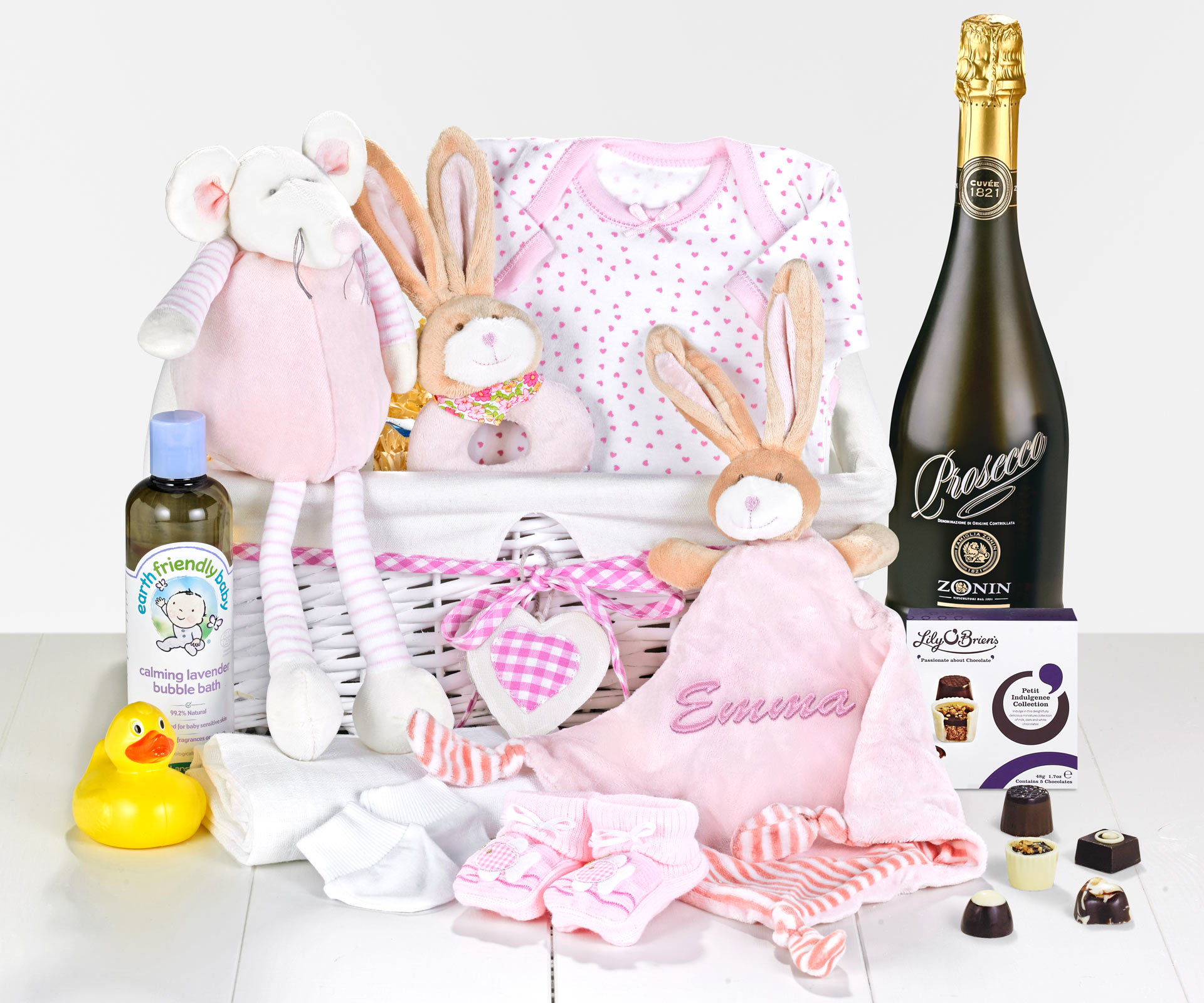 Traditionally styled in pink and white for a girl, this pretty gift hamper is packed with wonderful presents for the new child including baby clothes, bath-time treats and soft toys. We also include some extra gifts for the parents of the new-born baby, with a celebratory bottle of Italian sparkling Prosecco wine and a delicious box of Lily O'Brien's Petit Indulgence chocolates. This Run Rabbit Run Hamper in Pink with Prosecco and Chocolates features a short-sleeved suit for a baby girl plus baby booties and a pair of protective scratch mitts for small hands. Inside this attractive high-sided willow tray we place several lovely gifts from the MouseHouse collection, including a blue ‘Nursery Rabbit' comfort blanket plus baby rattle and a cuddly and huggable ‘Big Mouse' soft toy. We then add some calming lavender bubble bath and a cute rubber duck for bath-time fun as well as a pack of muslin squares that always come in handy when there's a new-born baby to look after. This pretty willow tray is decorated with a golden gift ribbon prior to delivery. Remember to add your personal greetings message when you order this hamper online to make your present even more special. As this gift hamper contains alcohol it is not suitable for under 18s.