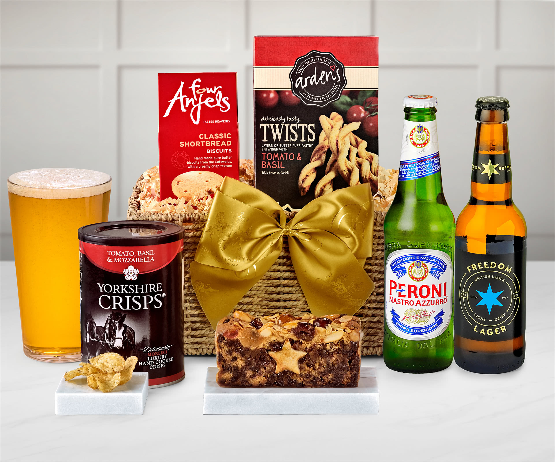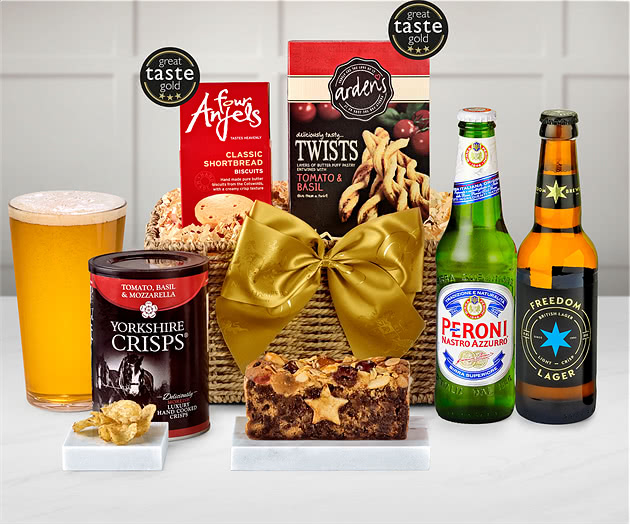An ideal gift for anyone who enjoys the finest lager beer with two bottles of superb continental-style lager plus savoury and sweet treats for any celebration or special occasion. Our Clarendon Hamper with Lager Beer includes a bottle each of Hop House 13 Lager and Peroni Italian lager beer accompanied by a range of excellent food items presented in a stylish seagrass tray. Savoury snacks include a packet of Tomato, Basil and Mozzarella flavoured Yorkshire Crisps plus a pack of Arden's Tomato & Basil Puff Pastry Twists that complement the lager beer choices in this Clarendon Hamper. Sweet delights include Cotswold Luxury Shortbread from Four Anjels and a rich Fruit & Nut Slab Cake decorated with a marzipan star and icing sugar dusting from The Cotswold Gourmet. All gifts from Regency Hampers are beautifully packed and presented. This Clarendon Hamper in its elegant seagrass tray arrives decorated with a golden hand-tied ribbon and you can add your own personalised message. As this gift hamper contains alcohol it is not suitable for under 18s.