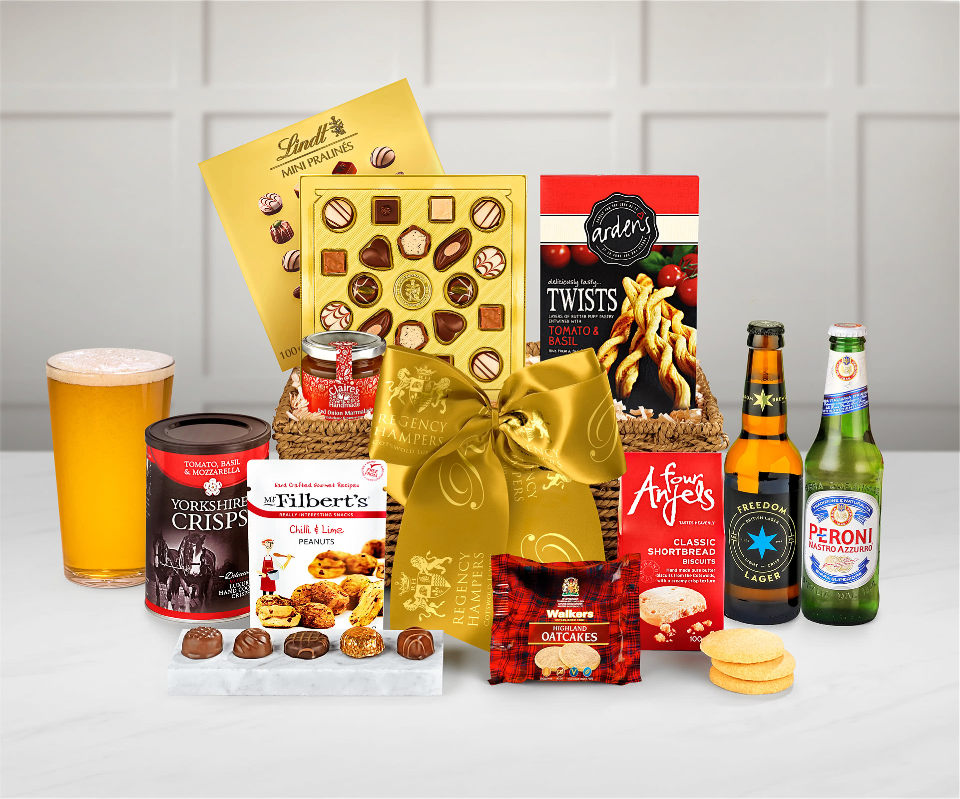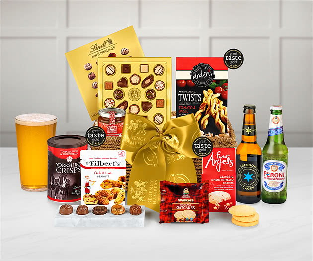 This Cotswold Hamper with Lager Beer is a perfect present for beer lovers with its two refreshing bottles of continental-style lager plus many more delicious savoury and sweet treats. Inside this stylish seagrass tray you'll find bottles of Hop House 13 Lager and Peroni Italian Lager Beer together with complementary beer snacks, including Tomato, Basil and Mozzarella flavoured crisps, puff pastry twists and ‘Perfectly Scrumptious' Spicy Peanuts from The Dorman. Within this Cotswold Hamper with Beer you'll also find such further savoury delights as Walkers Highland Oatcakes and a delicious jar of Claire's handmade Red Onion Marmalade. Meanwhile, the sweet treats in this Cotswold Hamper with Lager Beer include Four Anjels Cotswold Luxury Shortbread and a tempting assortment box of Thorntons Classic Collection Chocolates. Gifts from Regency Hampers are always beautifully packaged and presented. This Cotswold Hamper in its elegant seagrass tray arrives decorated with a golden hand-tied ribbon. Choose the best delivery date when you place your order which is when you can also add your own personalised message.