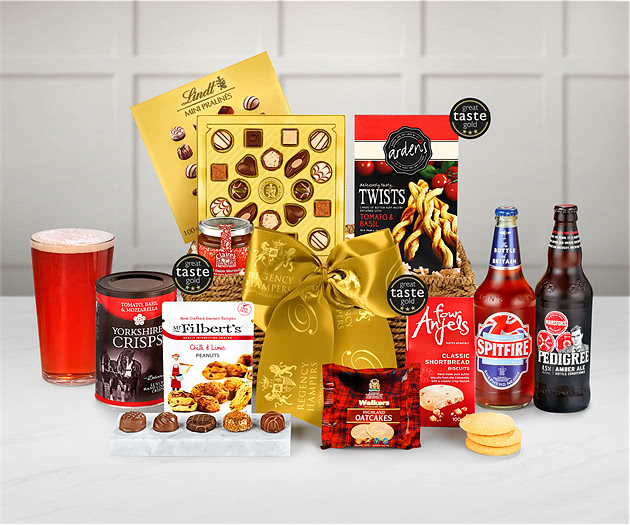 This Cotswold Hamper with Real Ale is a perfect present for lovers of traditional British bitter beer with its two bottles of real ale plus a choice selection of savoury and sweet treats. Inside this elegant seagrass tray you'll find a bottle each of Marston's Pedigree Amber Ale and Shepherd Neame's Spitfire Premium Kentish Ale together with such tasty beer snacks as Tomato, Basil and Mozzarella flavoured crisps, puff pastry twists and ‘Perfectly Scrumptious' Spicy Peanuts from The Dorman. Within this Cotswold Hamper with Real Ale you'll also find further savoury delights with Walkers Highland Oatcakes and a delicious jar of Claire's handmade Red Onion Marmalade. The sweet treats in this Cotswold Hamper with Real Ale include Four Anjels Cotswold Luxury Shortbread and a tempting assortment box of Thorntons Classic Collection Chocolates. Gifts from Regency Hampers are beautifully packaged and presented and so this Cotswold Hamper arrives with its stylish seagrass tray decorated with a golden hand-tied ribbon. Select the best delivery date when you place your order which is when you can also add your own personalised greetings message.