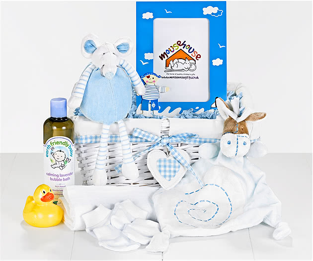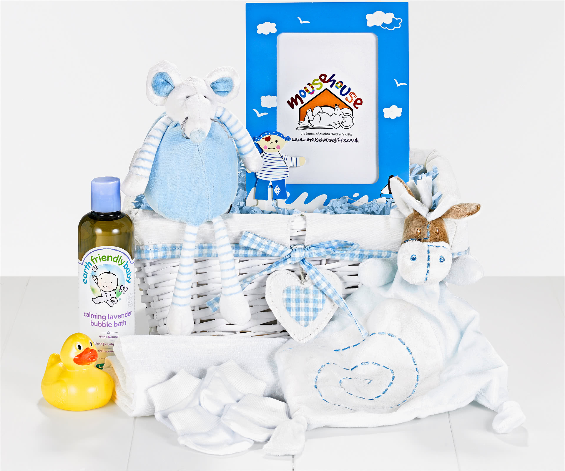 This Little Ducks Hamper in Blue is a charming present for a new baby boy or a very young child with its selection of beautiful soft toys and bath-time treats contained within a pretty high-sided white wicker tray with a delightful blue gingham liner. Carefully packed inside this wicker basket you'll find a selection of soft toys from MouseHouse featuring a little blue and white donkey comfort blanket and a cuddly plush mouse in pastel blue. We also include a cute ‘patch pirate' wooden picture frame together with a pack of muslin squares and a pair of little scratch mitts for a baby's tiny hands. Then we add a bottle of lavender bubble-bath from Earth Friendly Baby and a traditional rubber duck who is there to share in bath-time playtime. This thoughtful gift basket for a baby boy is beautifully packaged and presented and arrives decorated with a golden greetings ribbon tied in a bow. Choose the most suitable date for delivery when you order this Little Ducks Hamper in Blue when you can also add your own personalised message.