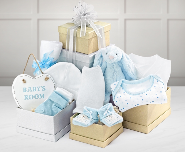 Exquisite Baby Essentials Collection: This thoughtfully curated tower features premium baby clothing, including a charming blue baby boy short sleeve suit, cosy white cotton sleep suit, and adorable blue booties. Complete with practical turnover socks, cotton hat, muslin cloth, and pull-over bib, we've covered every essential for your newest arrival.