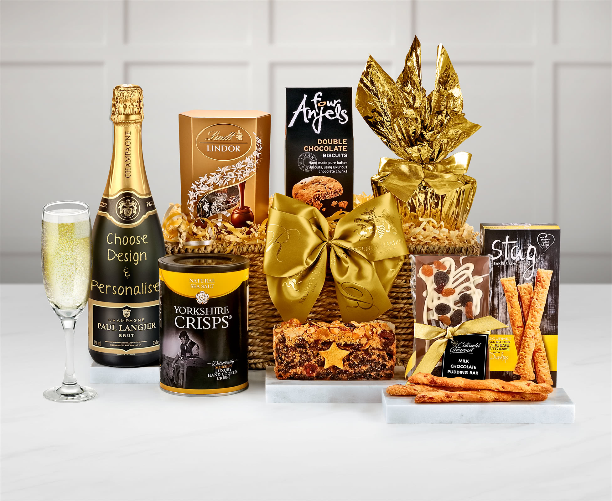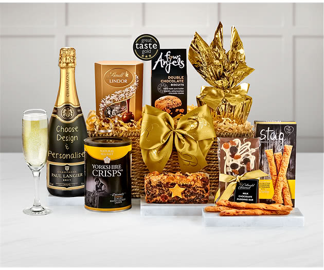 Our charming Chedworth Hamper with its superb bottle of personalised Champagne also features an excellent selection of savoury and sweet treats: from Yorkshire Crisps to Swiss chocolate truffles. This wonderful gift hamper contains a personalised bottle of Paul Langier Brut Champagne where you can add the recipient's name to a range of celebratory labels to make this a truly unique present. As well as the sparkling bottle of Champagne this attractive woven sea-grass tray contains such food treats as savoury Cheese Straws and Natural Sea Salt Yorkshire Crisps. For sweet pleasures we add Four Anjels Double Chocolate Biscuits together with Fruit and Nut Slab Cake with Marzipan Star from The Cotswold Gourmet and a Strawberry Steamed Pudding to this Champagne gift hamper. And to complete this delightful Chedworth Hamper we offer you a pack of Lindor Assorted Chocolate Truffles from the famous Swiss chocolatiers Lindt. Choose your preferred date for delivery when you place your order for this delightful Chedworth Hamper with Personalised Champagne when you can also add your own greetings message.