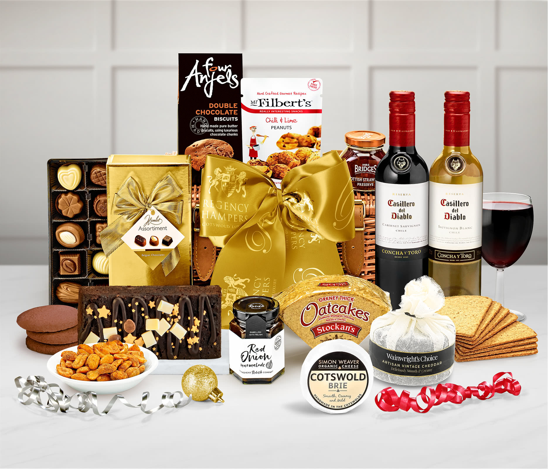 Artisan Cheese & Accompaniments: The cheese selection features Wainwright's Choice Black Waxed Farmhouse Cheddar, together with Simon Weaver's Organic Cotswold Brie. Paired with Stockan's Orkney oatcakes and Hawkshead's red onion marmalade, it offers a Christmas cheeseboard experience right out of the basket.