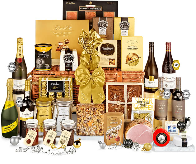 Gourmet Artisan Delicacies: Savour Scottish smoked salmon, honey-glazed ham, and three artisan cheeses, including Cotswold Brie and Blue Stilton. Sweet treats abound with luxury fruit cake, Swiss chocolates from Lindt, and traditional Christmas pudding, creating the ultimate gourmet experience.