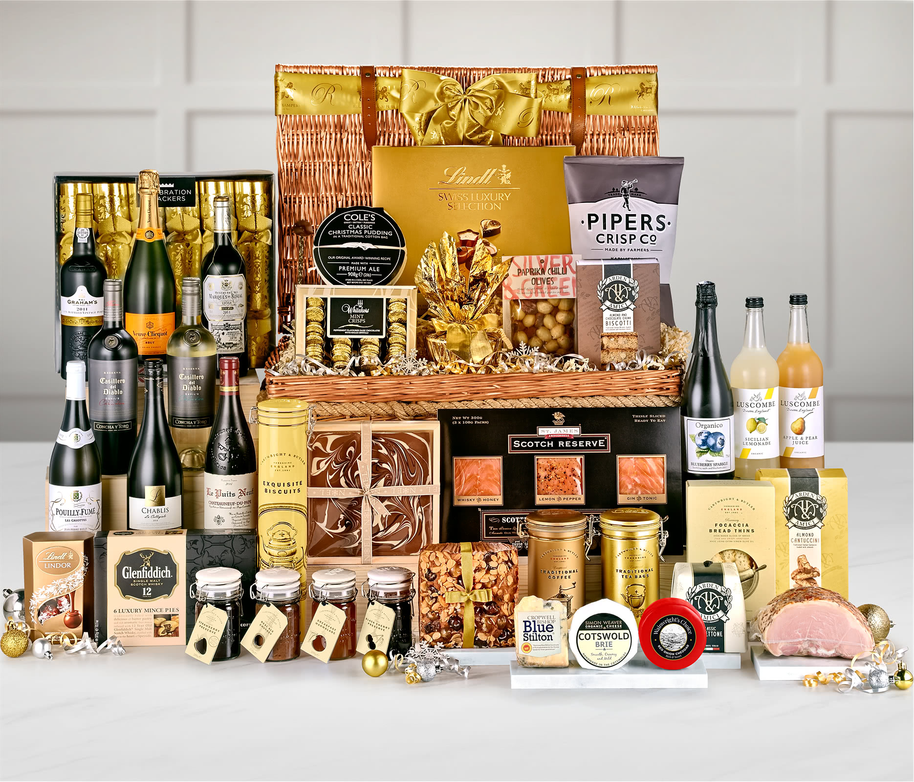 Artisanal Gourmet Delicacies: This collection is a true testament to festive luxury - including Scottish smoked salmon, honey-glazed ham, cantuccini, focaccia thins and a trio of British cheeses. Sweet delights feature Lindt chocolates, traditional Christmas pudding, and a classic mini panettone, all beautifully presented in a handcrafted willow basket.